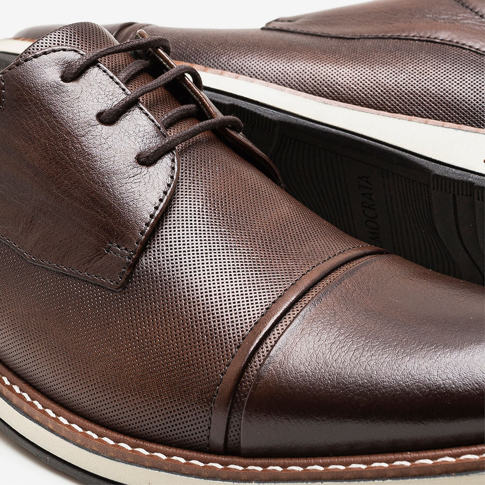 Sapato Metropolitan Oliver Mogno de couro confortávelO Sapato Metropolitan Oliver Mogno é sinônimo de elegância e conforto no mesmo design. Criado para o homem moderno, que busca um visual refinado sem abdicar da leveza no dia a dia, esse sapato traduz a essência da Democrata: sofisticação acessível.O modelo combina o clássico estilo derby com o toque contemporâneo do couro mogno — um tom marcante que veste superbem em qualquer ocasião.Especificações sobre o sapato de couro marromMaterial: couro legítimo na cor mogno;Solado: E.V.A, leve e resistente;Altura do solado: 2,5 cm;Fechamento: cadarço de amarrar;Estilo: derby;Detalhes: cabedal com recortes sutis e forro em tecido;Palmilha: fixa, com toque macio e confortável.Principais diferenciais do sapato marrom de couroO Metropolitan Oliver Mogno é o sapato de couro marrom que une design robusto e acabamento impecável. Sua construção garante estabilidade e leveza, enquanto o couro natural confere durabilidade e um aspecto elegante com o passar do tempo. Um modelo democrático, sofisticado e versátil, pensado para quem valoriza conforto e presença.Como usar o sapato de couro marrom?O sapato marrom de couro é um curinga do guarda-roupa masculino. Ele vai bem com jeans escuro, chinos ou até alfaiataria, criando combinações certeiras para o trabalho, jantares ou eventos casuais sofisticados. Seu tom mogno adiciona personalidade ao look, sem exageros.Como saber se o sapato é de couro legítimo?O couro legítimo do calçado masculino tem textura natural, com pequenas variações que tornam cada par único. Além disso, ele é mais maleável e respirável, adaptando-se aos pés com o tempo. O Metropolitan Oliver Mogno traz essa autenticidade, reforçando o padrão de qualidade da Democrata.O Sapato Metropolitan Oliver Mogno é a escolha perfeita para quem busca elegância e conforto no mesmo passo — um verdadeiro protagonista em qualquer produção.