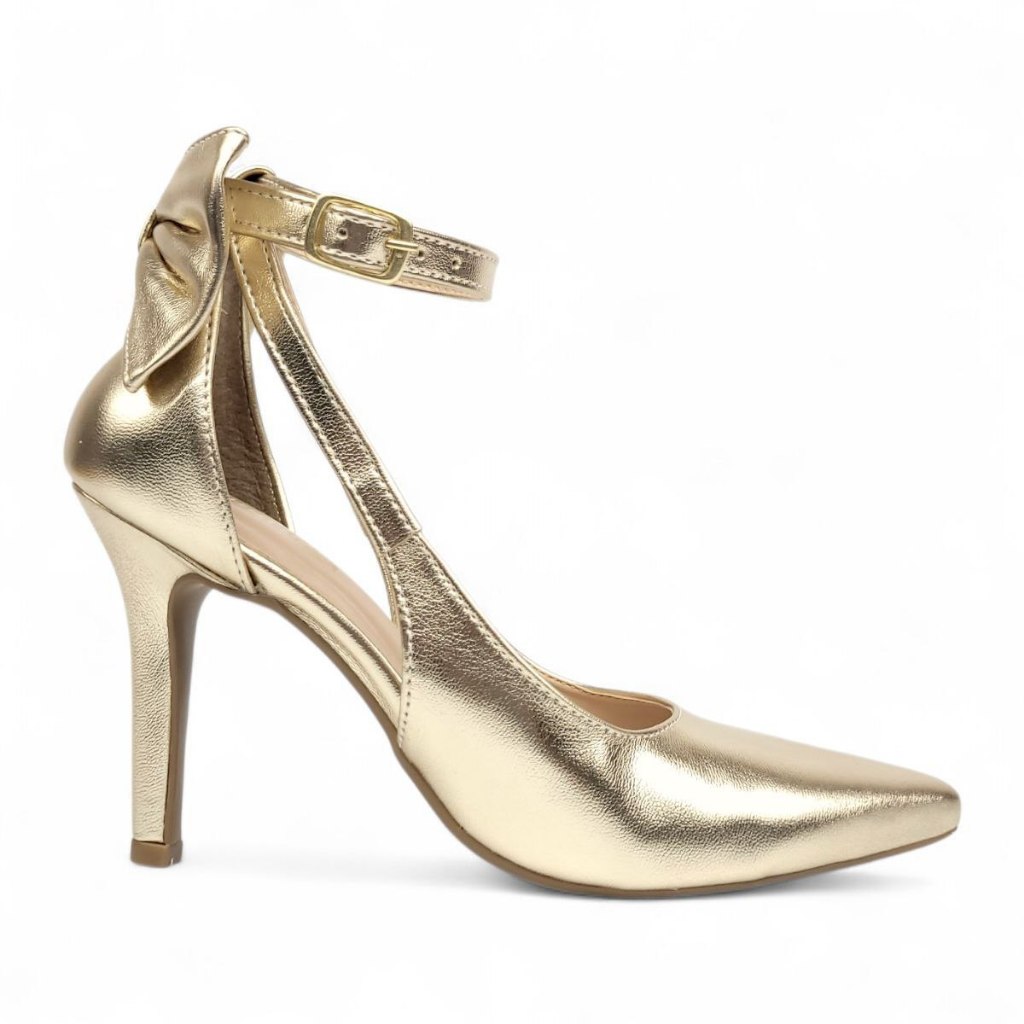 Sapato Scarpin Dourado Salto Alto Bico Fino Com Laço 9,5cm