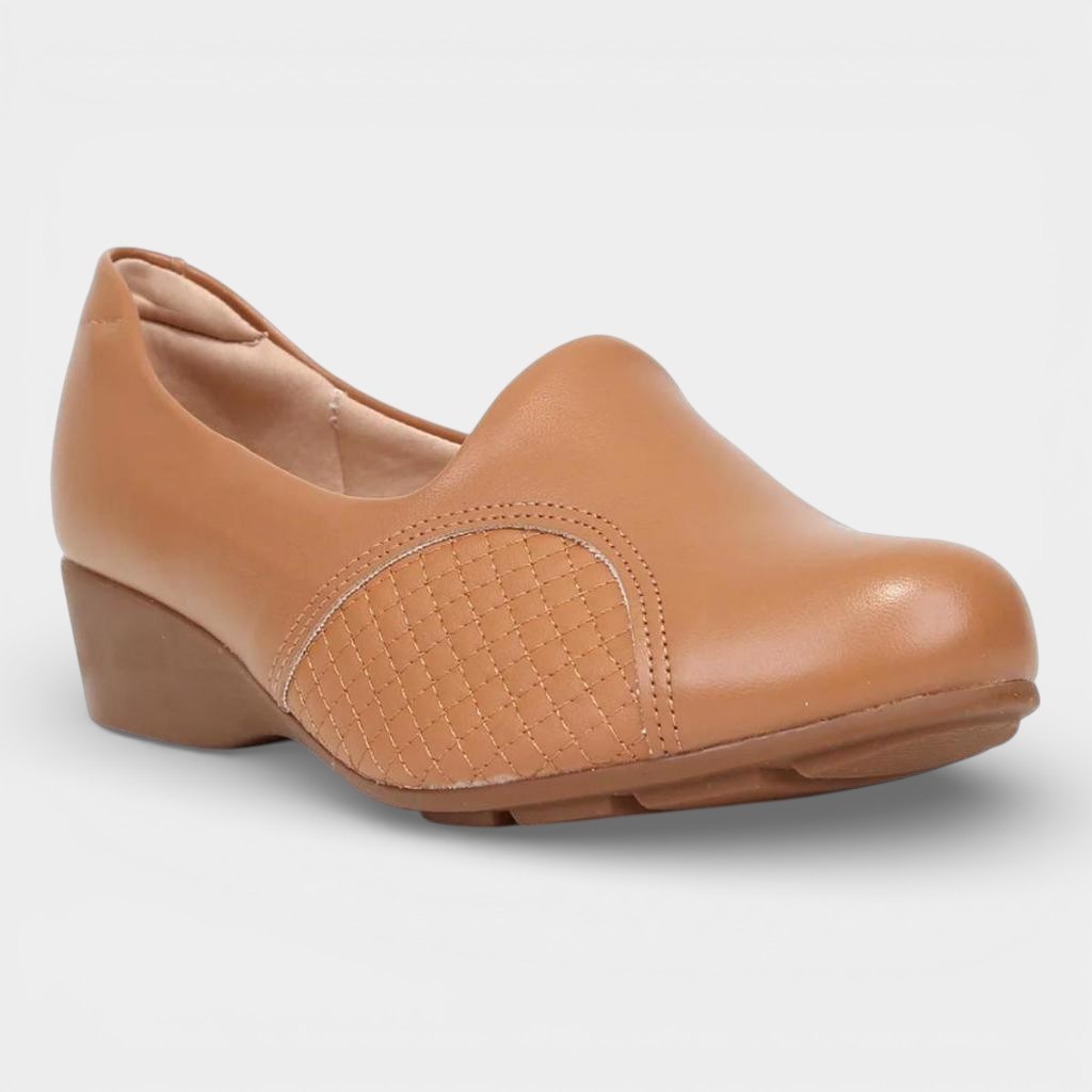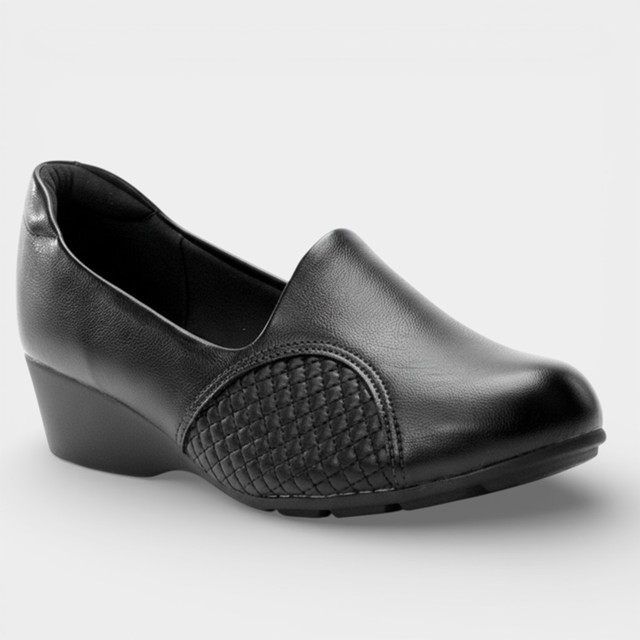 O scarpin Modare tem como diferencial o salto anabela e o cabedal flexível nas laterais, que promovem maior conforto para quem precisa de cuidados com o joanete. Um estilo clássico com o bem-estar que o dia a dia pede.
