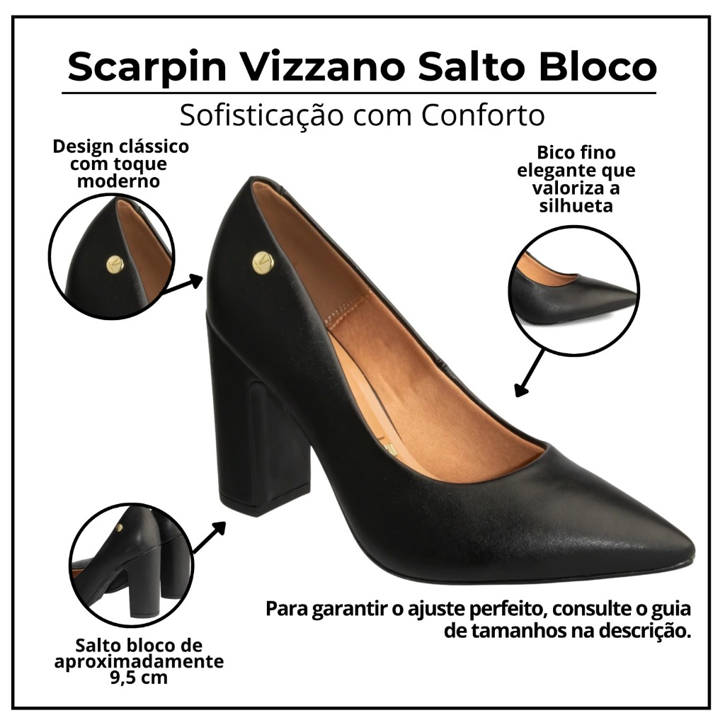 👠 Sapato Scarpin Vizzano Feminino Salto Bloco 9,5cm Original ✨ O Scarpin Vizzano é a escolha perfeita para quem busca sofisticação sem abrir mão do conforto. Com design clássico e elegante, alonga a silhueta e valoriza qualquer look, sendo ideal para festas, eventos, trabalho ou ocasiões especiais. O salto bloco garante mais estabilidade que os modelos tradicionais, proporcionando charme e confiança em cada passo. ✅ Diferenciais do Produto 👠 Modelo elegante e atemporal 🌟 Estabilidade e conforto ao caminhar 💃 Ideal para festas, eventos e trabalho ✨ Palmilha macia para maior bem-estar ✔️ Produto original Vizzano 📋 Ficha Técnica Marca: Vizzano Modelo: Scarpin Feminino Salto Bloco Gênero: Feminino Estilo: Clássico / Social / Festa Altura do salto: 9,5 cm (aproximado) Material externo: Sintético Material interno: Têxtil macio Palmilha: Confortável Solado: Borracha antiderrapante Fechamento: Calce fácil (sem fivela) 🧼 Dicas de Limpeza Passar pano macio levemente úmido Usar sabão neutro em pequenas áreas, se necessário Secar à sombra em local ventilado Evitar exposição direta ao sol ou calor 📏 Tabela de Tamanhos (cm aproximados) 34 – 22,5 cm 35 – 23,0 cm 36 – 23,5 cm 37 – 24,0 cm 38 – 24,5 cm 39 – 25,0 cm