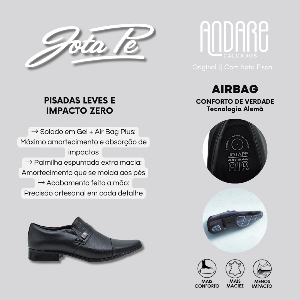 FORMA: Normal (Ver tabela de medidas). CABEDAL: Couro carneiro premium, macio e flexível, com acabamento artesanal que garante durabilidade e visual sofisticado. DESIGN: Social moderno com bico quadrado, textura refinada e pin metálico da marca, unindo estilo clássico e contemporâneo. FECHAMENTO: Calce fácil com elástico lateral embutido que substitui cadarços, oferecendo ajuste firme e prático. FORRO: Interno em poliuretano de toque suave, que evita atritos e mantém o conforto prolongado. PALMILHA: Espumada anatômica de alta densidade, moldável aos pés e com excelente amortecimento. AMORTECIMENTO: Tecnologia Air Bag Plus® com solado em Gel, que reduz impactos e melhora a estabilidade. SOLADO: Material leve e flexível, com aproximadamente 4 cm de altura, oferecendo boa tração e absorção de impacto. INDICAÇÃO: Ideal para uso social e profissional, combinando elegância, conforto e postura aprimorada. ENVIO: Na caixa original do fabricante. GARANTIA: 30 dias contra defeitos de fabricação. Muito além dos sociais tradicionais, o Sapato Social Jota Pe Air foi desenvolvido para quem busca unir elegância, conforto e praticidade em um único calçado. Com design refinado, flexibilidade surpreendente e tecnologia de amortecimento avançada, ele oferece presença marcante e bem-estar em todos os momentos — seja no trabalho, em reuniões ou em eventos especiais. Confeccionado em couro carneiro premium, o modelo é extremamente macio, flexível e se ajusta naturalmente aos pés desde o primeiro uso. Seu acabamento artesanal revela o cuidado da marca em cada detalhe, garantindo durabilidade, sofisticação e um visual impecável. A forração interna em poliuretano proporciona toque suave, evitando atritos e mantendo o conforto mesmo após horas de uso. O design atemporal combina o clássico e o moderno de forma equilibrada. O cabedal apresenta detalhes texturizados, bico quadrado e o pin metálico da marca, que reforçam a elegância do modelo. Além disso, o sistema de calce fácil, com elástico inteligente embutido nas laterais, substitui os cadarços e oferece praticidade, firmeza e ajuste perfeito, tornando o calçar rápido e confortável. A palmilha espumada extra macia é outro ponto de destaque: ela se molda ao formato dos pés e garante amortecimento contínuo. Aliada ao solado em Gel com tecnologia Air Bag Plus®, proporciona absorção de impacto, estabilidade e pisadas suaves. Essa combinação assegura conforto prolongado, mesmo em dias intensos. Com salto embutido discreto e estrutura ergonômica, o modelo oferece postura equilibrada e elegância natural. O resultado é um calçado que une design, tecnologia e conforto de forma harmoniosa. O Jota Pe Air é mais do que um sapato social — é um símbolo de sofisticação prática, feito para quem lidera com estilo e exige conforto absoluto em cada passo. TABELA DE MEDIDAS Tamanho 37 - 24,7cm Tamanho 38 - 25,3cm Tamanho 39 - 26,1cm Tamanho 40 - 26,7cm Tamanho 41 - 27,3cm Tamanho 42 - 28,1cm Tamanho 43 - 28,8cm Tamanho 44 - 29,4cm Tamanho 45 - 30,1cm