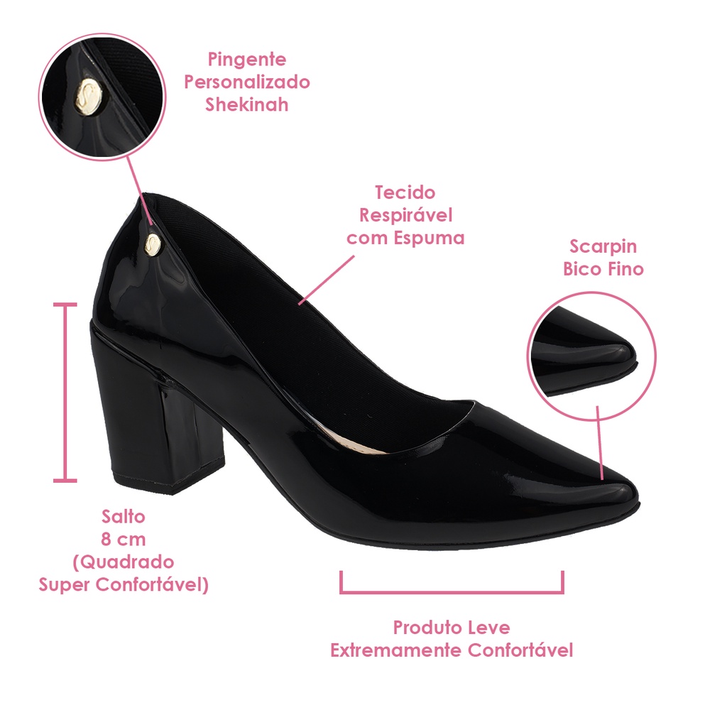 Sapato Social Scarpin Bico Fino Verniz Luxo Festa Shekinah Conforto Salto Alto Quadrado Bloco Macio