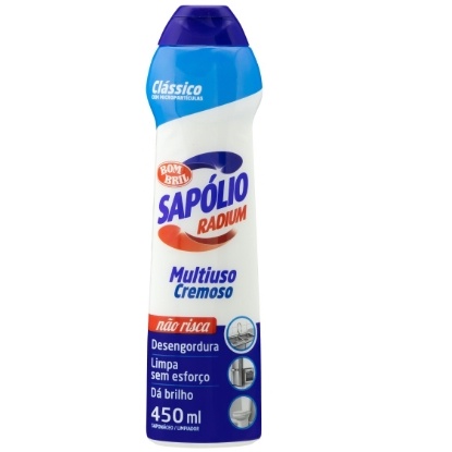 Fragrância: Clássico Modo de uso: Aplique o produto com pano macio e úmido ou com o lado macio da esponja e esfregue.Depois, remova-o completamente. Conservação: Mantenha o produto em sua embalagem original. Sapólio Radium Cremoso limpa e renova o brilho sem riscar. Ideal para limpar superfícies esmaltadas, cromadas, fórmicas, panelas e muitas outras. Sapólio, Sapólio Cremoso, Bombril. Dá brilho.Não risca.Limpa.