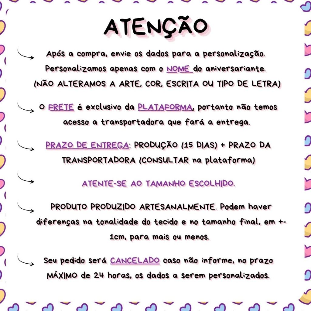 ✅Saquinhos Personalizados para lembrancinhas de nascimento, chá de bebê, aniversários, festas, eventos, etc. ✅ Nossos saquinhos são preparados em tecido 100% POLIÉSTER na cor MARFIM, com fechamento em cordinha de algodão crú unilateral (apenas de um dos lados). São estampados diretamente sobre o tecido, proporcionando com cores vivas que não desbotam e não saem com a lavagem. ✅ Para a personalização nos envie, imediatamente, após a compra, o NOME para a personalização. Personalizamos essa arte apenas com os dados DO ANIVERSÁRIANTE. ✅ Trabalhamos com dois tamanhos: LARGURA X ALTURA: 15x20(PEQUENO) e 20x25(MÉDIO), tenha atenção ao escolher o tamanho. Sugerimos que faça um saquinho de papel no tamanho de sua escolha para que tenha uma noção do tamanho. Qualquer dúvida não deixe de nos perguntar. ✅ PRAZO DE ENTREGA = prazo de produção + prazo do envio da Transportadora. O prazo de entrega encontra-se na página do anúncio no campo "FRETE" 🚚, é só clicar ali que a Shopee informa o prazo para a entrega no endereço cadastrado na sua conta. Considerar o maior prazo. É de grande importância verificar o prazo pois se trata de um produto personalizado, nele dedicamos nosso tempo, cuidado e carinho em seu preparo. 🚫NÃO ALTERAMOS A ARTE , MODELO E COR DE LETRA, ALTERAMOS APENAS O NOME E IDADE CASO TENHA ESSA OPÇÃO EM NOSSO ANÚNCIO. 🚫ATENTE-SE AO CHAT, todo nosso contato será por ele. Caso não seja enviado dos dados para a personalização em ate 48horas após a aprovação do pedido, seu pedido será cancelado. 🚫Não enviamos prévia, por isso, atente-se a escrita. Não aceitamos devoluções de produtos personalizados por erro de digitação de nome e idade fornecido pelo comprador. 🚨A tonalidade da cor pode variar de monitor para monitor, por isso, podem haver diferença na tonalidade entre o produto físico e a foto do anúncio. 🚨Por se tratar de um produto feito artesanalmente pode haver diferença de até 1cm em largura e altura no tamanho final . ***** NÃO ACHOU O TEMA DA SUA FESTA? Entre em contato com a gente para confirmar a disponibilidade =) QUALQUER DÚVIDA OU INFORMAÇÕES, ESTAMOS À DISPOSIÇÃO.