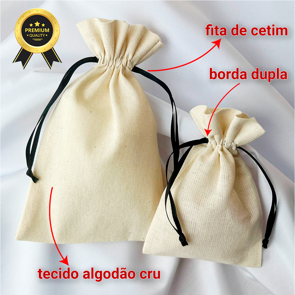 Saquinho Ecológico de algodão cru produto sustentável Envio imediato Informações técnicas Cordão: Fita de cetim PRETO Cor do Tecido: Natural Personalização: KIT RESSACA COR VERMELHO SILK SCREEN. NÃO FAZEMOS MUDANÇA DE COR E ARTE Invista em uma embalagem charmosa e sustentável para os seus produtos com os saquinhos de algodão cru da EmbalArts!