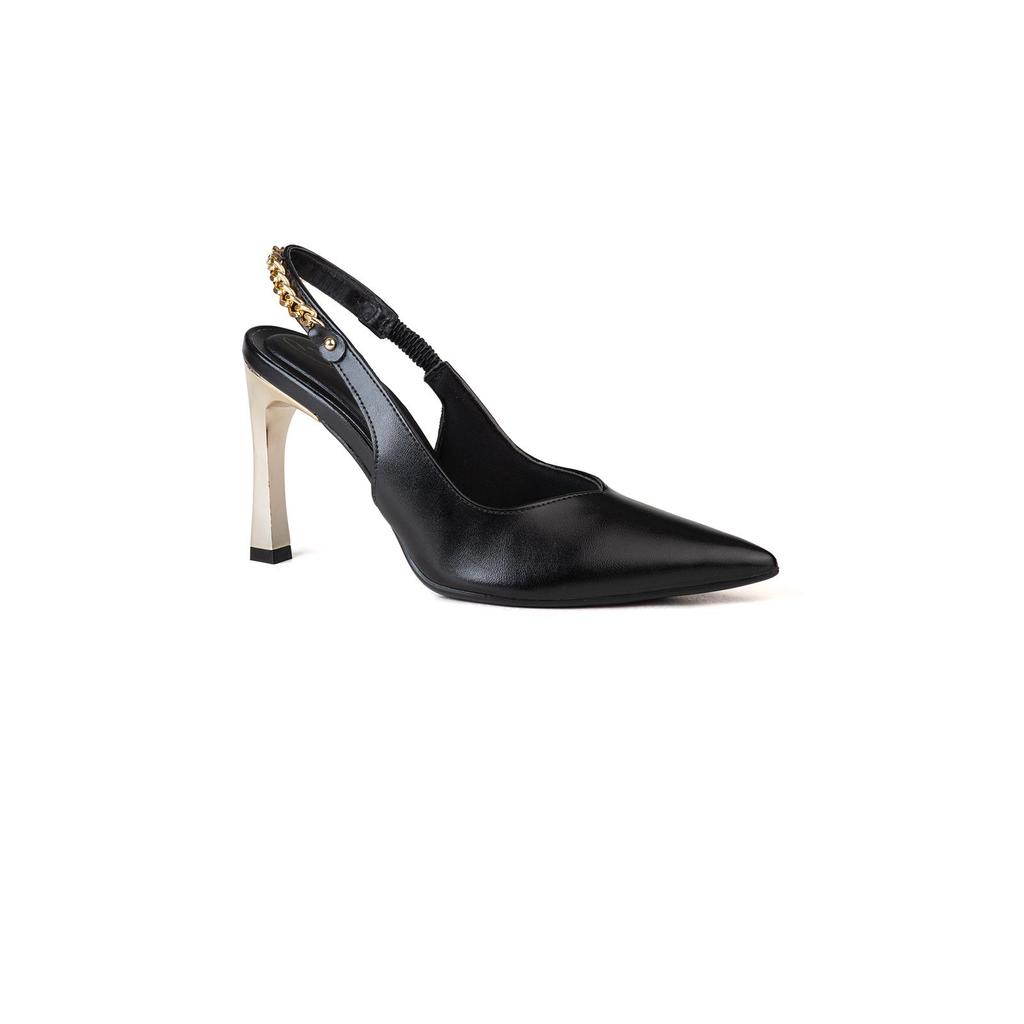 Scarpin slingback Bebecê com assinatura Simone Mendes e detalhe corrente no calcanhar. Elástico para calce prático, palmilha assinada com espuma. Salto alto moderno com acabamento metalizado chique.