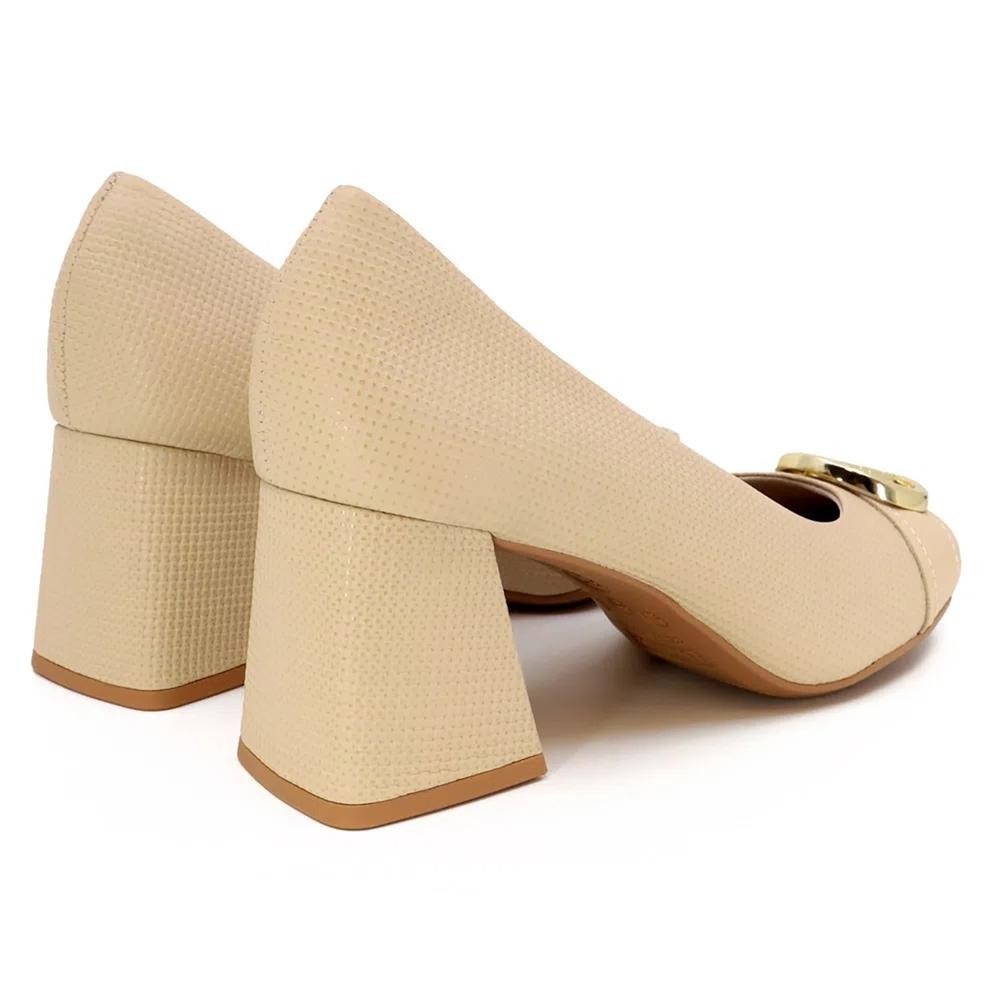 Scarpin Couro Usaflex Salto Bloco Fivela Monograma - Bege