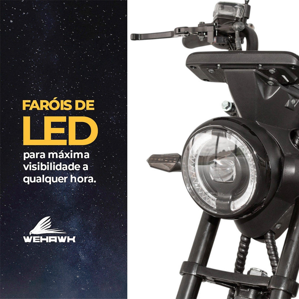🛵 Scooter Elétrica WeHawk WX-11 – Potência, Estilo e Mobilidade Sustentável ⚡ Descubra a Scooter Elétrica WeHawk WX-11, perfeita para quem busca mobilidade urbana com conforto, estilo e sustentabilidade. Com motor brushless de 1000W e bateria de lítio removível, esta e-scooter oferece tecnologia avançada e praticidade, sem necessidade de CNH! ⚙️ Especificações Técnicas Motor e Desempenho Marca: WeHawk Modelo: WX-11 Motor Brushless: 1000W Velocidade Máxima: Até 32 km/h Controladora: 60V Autonomia: 20 a 40 km* 🔋 Bateria e Carregamento Tipo: Bateria de lítio 60V 20Ah Bateria Removível para carregamento Carregador Bivolt: 67,2V 2Ah (127V/220V) Tempo de Carregamento: 8 a 10 horas Autonomia Sustentável: Perfeita para deslocamentos diários 📏 Dimensões e Capacidade Carga Máxima: 180 kg Capacidade: 2 pessoas Peso Bruto: 85 kg Peso Líquido: 80 kg Pneus: 10" dianteiro e traseiro Dimensões (cm): 165 x 120 x 70 Medidas entre eixos: 125cm 💡 Design e Tecnologia Iluminação LED: Farol alto e baixo para máxima visibilidade Painel Digital: Mostra velocidade, nível da bateria, odômetro e setas 🛡️ Conforto e Segurança Função Ré: Facilita manobras em espaços reduzidos Alarme Antifurto: Com bloqueio e função liga/desliga Amortecedores: Dianteiro e traseiro para condução suave Freios a Disco: Dianteiro e traseiro para maior segurança Acessórios Inclusos: Chave reserva e controle de alarme Pressão dos Pneus: 32 a 34 libras, otimizada para estabilidade ℹ️ Informações Adicionais Sem CNH Necessária: Mobilidade acessível para todos Observação: Autonomia e desempenho da bateria podem variar conforme peso, trajeto e estilo de condução 🛡️Garantia Cobertura de 6 meses Cobertura estendida de 12 meses para bateria e motor ❗ Não cobre danos por mau uso, quedas ou modificações Observação: - Recomendamos o uso de capacete e itens de segurança. - Autonomia pode variar de acordo com trajeto e peso carregado. - Não deixe o produto por longos períodos descarregado. - Qualquer dano estético deve ser comunicado no ato do recebimento.