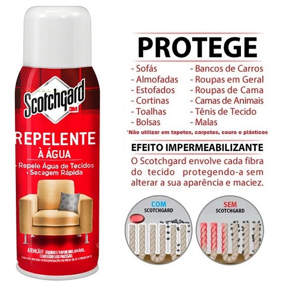 ScotchGard Protetor de Tecidos Spray 3M Detalhes do produto: O Scotchgard 3M Spray Impermeabilizante Protetor de Tecidos 3M é um protetor de fácil aplicação que envolve cada fibra do tecido, protegendo-a sem alterar a sua aparência e a sua maciez. Scotchgard 3M já é sinônimo de proteção no segmento de imóveis. Fácil de aplicar, o Scotchgard 3M protege artigos como móveis, roupas, bancos de automóveis, acolchoados, telas de tecidos, toalhas de mesa, barracas, bolsas, tênis de tecido, guarda-chuvas, gravatas, etc. Inofensivo para a camada de ozônio. Caracteristicas: Sua função é proteger, evitando desbotamento, desgaste, evitando parcialmente manchas no tecido, etc. Fazendo assim, com que o tecido fique com aspecto de novo por muito mais tempo. Lógico, que irá repelir água também mas não é 100% e é muito difícil um produto no mercado repelir 100% de água. Use agora mesmo Scotchgard 3M nos bancos do seu veículo e no estofado da sua casa para impermeabilizar tecidos. Após ver o resultado da impermeabilização do Scotchgard 3M, se arrependerá por não ter conhecido antes esse maravilho produto que é o Scotchgard 3M. Scotchgard 3M é uma tecnologia desenvolvida pela 3M. Em 2003, o protetor Scotchgard 3M, mais uma grande inovação da 3M, completou 50 anos. E, depois de meio século de vida, o repelente a líquidos causadores de manchas, desenvolvido para proteger produtos têxteis - carpetes, móveis, toalhas de mesa e até mesmo roupas - e deixá-los com boa aparência por mais tempo, já virou sinônimo de categoria. OBS: Não utilize o produto em tapetes, carpetes, couro, suede, veludo e camurça!!! Conteúdo: 353ml - 283g Composição: Destilados de petróleo leves hidrotratados; Gases liquefeitos de petróleo; Mistura de silicone; Resina; Reticulante. (Pode haver alterção do fabricante sem aviso prévio). Rendimento: O conteudo de uma lata protege 1 sofá de tamanho médio, 2 cadeiras ou 5 jaquetas. A cobertura varia de acordo com tamanho, tipo de tecido e quantidade aplicada.