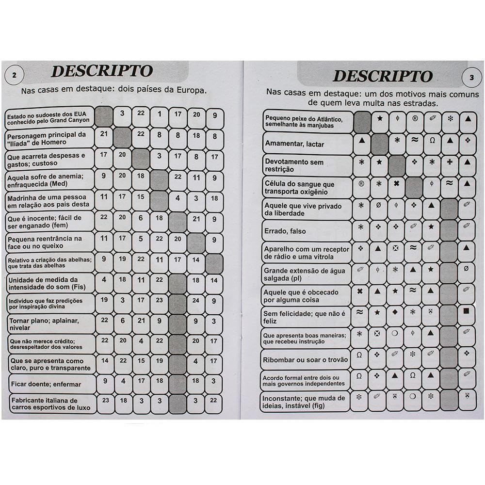 Descripto é uma abordagem criativa para exercitar a associação de palavras e símbolos, ampliando sua lógica. Cada enigma solucionado é um passo em direção a uma mente mais ágil e imaginativa. Demonstre suas habilidades e supere os desafios! 21x14 cm 32 Páginas