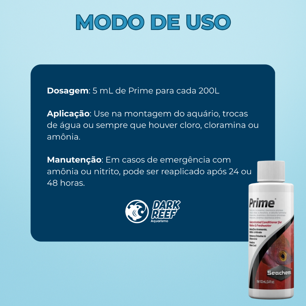 Seachem Prime Condicionador 50/100/325mL Remove Cloro e Amônia Aquário Diferenciais: - O 2º condicionador mais concentrado do mercado (atrás apenas do Aquavitro) - Rendimento excepcional: 5ml tratam 200L de água - Único produto que combina descloração + detoxificação O Seachem Prime é um condicionador de água premium que: - Elimina cloro e cloramina instantaneamente - Transforma amônia, nitrito e nitrato em compostos não tóxicos - Protege os peixes durante montagem do aquário ou trocas parciais - Não altera o pH da água - Neutraliza metais pesados (como cobre, chumbo e zinco) Principais Características: - O removedor de cloro mais confiável entre aquaristas brasileiros - Condicionador completo e concentrado para água doce e salgada - Remove cloro, cloramina, amônia, nitrito e nitrato - Neutraliza metais pesados presentes na água da torneira - Altamente concentrado – rende 5x mais que concorrentes - Dosagem econômica: 5ml tratam 200L de água MODO DE USO Use 1 tampinha (5 mL) para cada 200 L de água nova. Pode ser adicionado diretamente ao aquário, mas é melhor se adicionado primeiro à água nova. Para concentrações excepcionalmente altas de cloramina, uma dose dupla pode ser usada com segurança. Se a temperatura for maior que 30 °C e os níveis de cloro ou amônia estiverem baixos, use meia dose. DOSES DE EMERGÊNCIA Se seus níveis de amônia ou nitrito estiverem acima de 2 ppm, você pode usar com segurança até 5 vezes a quantidade recomendada. Dica profissional: Para ciclagem inicial, combine com Seachem Stability Para transporte de peixes, use com Seachem StressGuard Especificações: - Marca: Seachem - Modelo: Prime - Tipo: Para peixes de água doce e salgada - Volume: 100ml PERGUNTAS FREQUENTES P: Acho que meu Prime pode estar velho porque está com cheiro de estragado. R: O Prime tem um odor muito distinto, semelhante ao enxofre, o que é completamente normal. P: Notei algumas pequenas manchas pretas no fundo do meu frasco de Prime®. Ainda está bom? R: A presença de pequenas manchas pretas ocorre ocasionalmente e é normal. P: Com que frequência posso usar o Prime? R: O Prime pode ser administrado a cada 48 horas. P: O Prime® tem validade? R: Não, desde que o Prime tenha sido armazenado corretamente, ele durará indefinidamente.