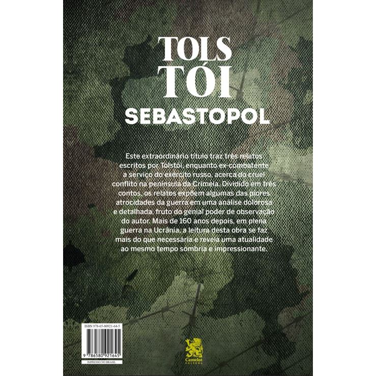 Este extraordinário título traz três relatos escritos por Tolstói, enquanto ex-combatente a serviço do exército russo, acerca do cruel conflito na península da Crimeia. Dividido em três contos, os relatos expõem algumas das piores atrocidades da guerra em uma análise dolorosa e detalhada, fruto do genial poder de observação do autor. Mais de 160 anos depois, em plena guerra na Ucrânia, a leitura desta obra se faz mais do que necessária e revela uma atualidade ao mesmo tempo sombria e impressionante. DESCRIÇÃO DO PRODUTO: ISBN13: 9786580921645 Páginas: 128 Publicação: 1ª Edição - 2022 | Camelot Editora Encadernação: Brochura Formato: 15,1,0 x 23,0 cm Autor: Leon Toltói