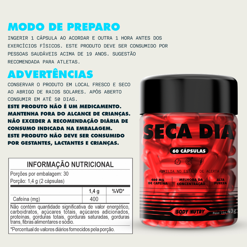 Seca Dia Body Nutry – 400 mg de Cafeína | Energia e Foco Máximo O Seca Dia Body Nutry foi desenvolvido para quem busca energia intensa, disposição ao longo do dia e mais foco nas atividades diárias. Sua fórmula conta com 400 mg de cafeína por porção, entregando um estímulo potente para treinos, rotina e performance diária. Com ingredientes selecionados, o Seca Dia auxilia na manutenção do ritmo ativo e no aumento da disposição, sendo ideal para quem precisa de um reforço energético consistente. Por que escolher o Seca Dia Body Nutry? 400 mg de cafeína por porção — alta potência e estímulo prolongado. Ajuda a melhorar o foco e a concentração. Contribui para aumentar a energia e disposição. Fórmula prática para uso diário. Produto com qualidade Body Nutry / Supplement Labs. Sugestão de Uso Consumir 1 cápsula ao dia, conforme orientação do seu profissional de saúde ou nutrição. ANVISA Registro ISENTO conforme resolução RDC 27 de 06 de agosto de 2010 anexo I. Registro ISENTO conforme resolução RDC 240/2018.