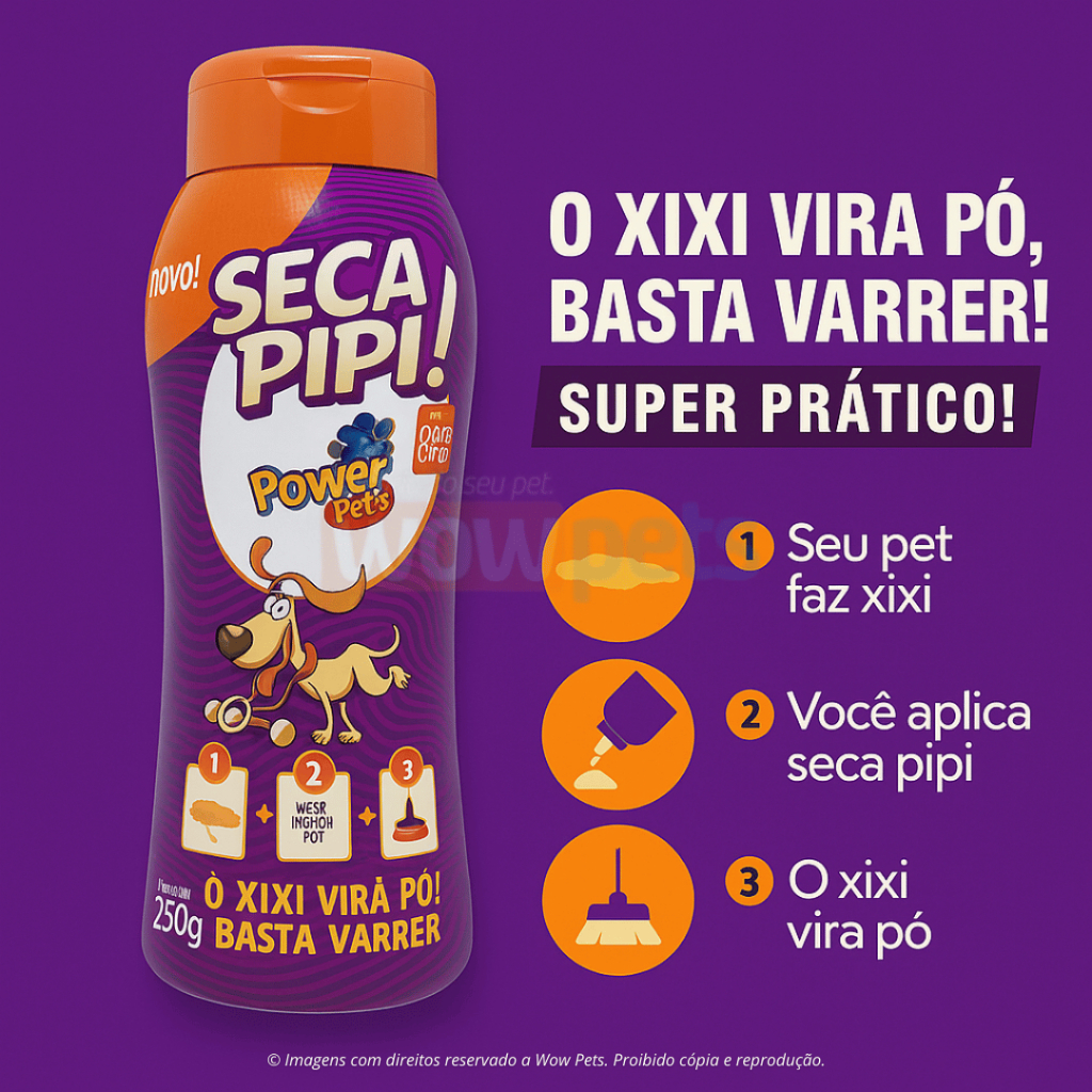 O Seca Pipi Power Pets 250g é a solução prática para manter a casa limpa, sem cheiro e sem bagunça! 🐾 Ele transforma xixi, fezes e até vômito em pó, facilitando muito a limpeza do ambiente. ✅ Benefícios 🧪 Transforma o xixi em pó seco rapidamente 🧹 Super prático: aplicou, secou, varreu 👃 Ajuda a neutralizar odores 🐕🐈 Indicado para cães e gatos 🏠 Pode ser usado em porcelanato, cerâmica, laminado, piso frio e mais 💡 Ideal para quem usa tapete higiênico ou mora em apartamento 📏 Tamanho / Apresentação - Conteúdo: 250 g - Modo: Pó higienizador - Uso: Para cães e gatos 🧪 Composição básica - Polímero absorvente - Essência - Agentes secantes 🧾 Modo de usar 1- O pet fez xixi? Aplique o produto diretamente sobre o líquido 2- Aguarde alguns segundos para o pó absorver. 3- O xixi vira pó! 4- Varra e descarte normalmente. 5- Para fezes e vômito, aplique por cima e remova após secar. ⚠️ Cuidados - Manter longe de crianças e animais - Não ingerir - Evitar contato com os olhos - Armazenar em local fresco e seco 🎯 Mensagem final Mantenha seu lar sempre limpo com muito mais praticidade! O Seca Pipi Power Pets torna a limpeza rápida, fácil e sem cheiro. 👉 Garanta já o seu!