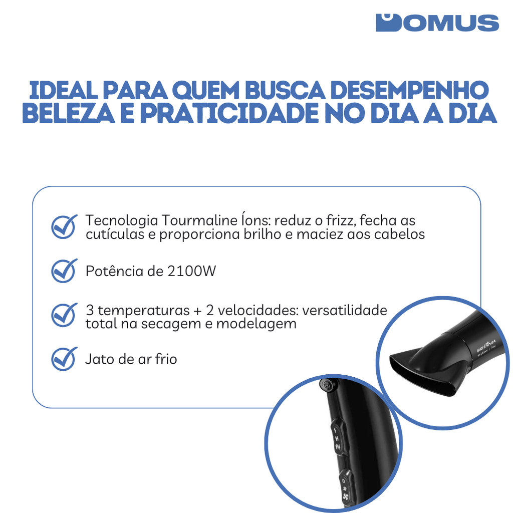 ***PRODUTO A PRONTO ENTREGA COM ENVIO IMEDIATO*** ITEM ORIGINAL COM NOTA FISCAL Somos a Domus, Loja oficial da Shopee. Temos 5 anos de experiência em E-Commerce e nosso maior objetivo é garantir a satisfação dos nossos clientes! Secador de Cabelo Britânia BSC2250 2100W Bivolt com Íons, Jato Frio e Bocal Concentrador mais brilho, menos frizz. O Secador Britânia BSC2250 com 2100W de potência e tecnologia Tourmaline Íons é ideal para quem deseja cabelos mais sedosos, brilhosos e com menos estática. Com ação de íons que fecham as cutículas dos fios, o resultado é um acabamento mais profissional sem sair de casa. Versátil e eficiente, oferece 3 temperaturas, 2 velocidades e jato de ar frio para fixar penteados. Especificações técnicas: Marca: Britânia Modelo: BSC2250 Potência: 2100W Voltagem: Bivolt Temperaturas: 3 Velocidades: 2 Jato de ar frio: Sim Tecnologia: Tourmaline Íons Motor: DC Acessórios: Bocal concentrador Comprimento do cabo: 1,90m Cor: Preto Resultado de salão em qualquer lugar com brilho, leveza e praticidade para o seu dia a dia.