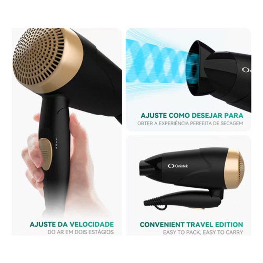 Secador De Cabelo Onistek Dobrável 1200W/1600W Ar Quente E Frio Portátil Premium Preto E Dourado