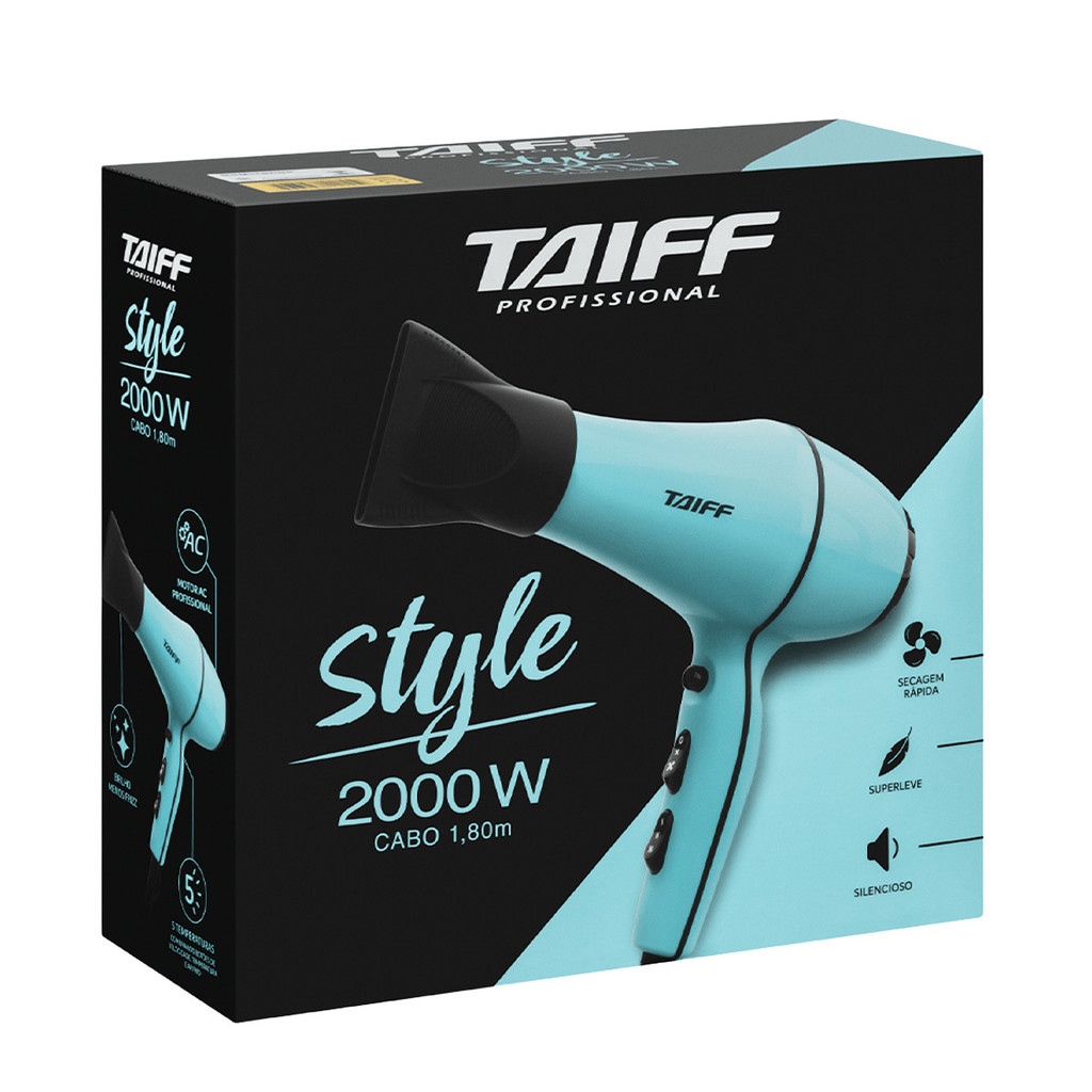 Secador Taiff Style, azul tiffany, ideal para uso pessoal, proporciona agilidade e rapidez na secagem e modelagem dos cabelos, com sua potência de 2000W, possui motor Ac profissional com maior durabilidade e mais silencioso (certificado pelo Inmetro) e super leve, possui chave seletora de temperaturas podendo fazer um combinado de temperaturas, velocidades e botão para jato de ar frio, oferecendo 5 temperaturas diferentes. Destaques Potência, estilo e mais silêncio Com potência de 2000W e motor AC Profissional, o secador Style é mais silencioso e proporciona uma secagem rápida, com qualidade profissional. Seu design é superleve e moderno. Resultado Ao usar o Style, imediatamente você já pode perceber o resultado: secagem rápida e cabelos com mais brilho e menos frizz. Na medida certa O cabo de 1,80 metro de comprimento é ideal para ser usado em espaços menores, garantindo a praticidade na hora da secagem e modelagem dos fios. Características Velocidades: 02 Bico Direcionador Bocal Direcionador Grade de Entrada de Ar Removível Filtro de Ar Removível Especificações Técnicas Modelo: 331/332 Comprimento do Fio: 1,80 m Potência: 2000W Consumo de Energia: 2,0 kWh (110V) / 1,83 - 2,0 kWh (220V) Cor: Azul Voltagem: 110V ou 220V (não é bivolt) EAN: 7898588111545 (110V) / 7898588111552 (220V) Garantia: 06 meses Dimensões e Peso Dimensões do produto sem embalagem (AxLxP): 215x87x210 mm Dimensões do produto com embalagem (AxLxP): 251x101x256 mm Peso do produto sem embalagem: 0,687 kg Peso do produto com embalagem: 0,891 kg Itens Inclusos 01 Secador 01 Bico direcionador Manual