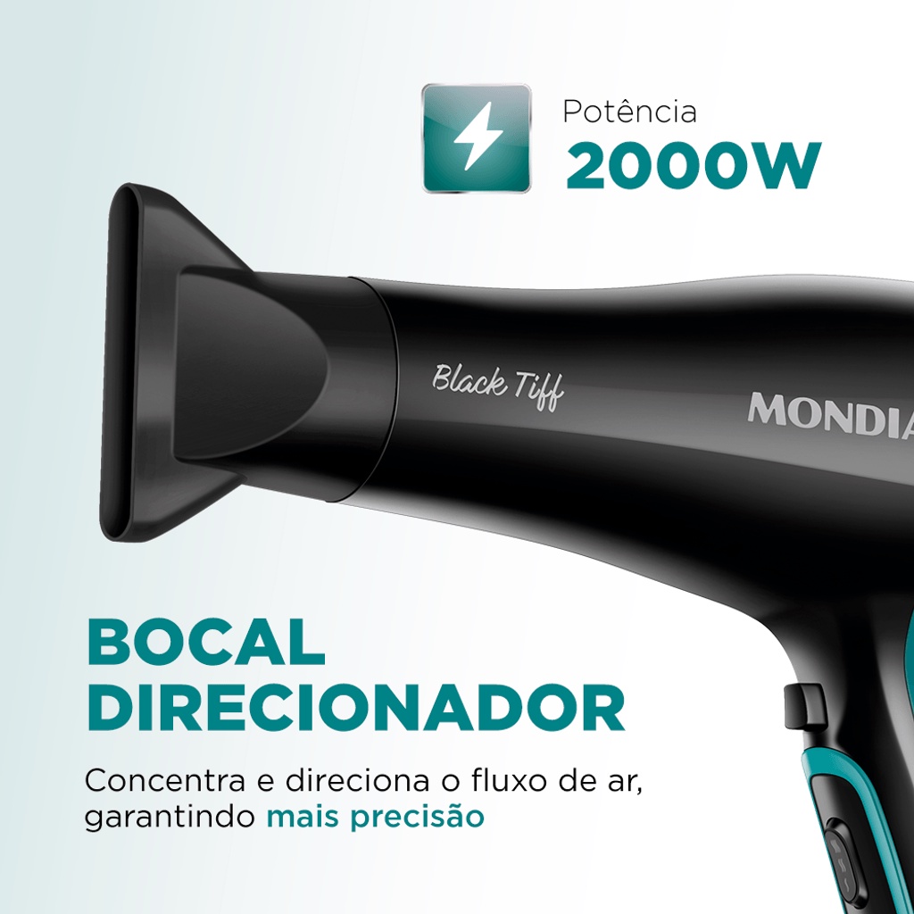 Agilidade e praticidade na sua rotina! Os 2.000W de potência do Black Tiff SCN-16 garantem um excelente desempenho para secagem ágil e eficiente dos fios. Além disso, a tecnologia Tourmaline Íon proporciona um aspecto mais saudável aos fios, reduzindo o frizz! Saiba mais sobre o Secador de cabelo Mondial: TOURMALINE ÍON: Com o calor, o mineral emite íons negativos que fecham as cutículas dos fios e reduzem o frizz. Seu cabelo fica mais brilhante e macio! ALTA POTÊNCIA: Os 2.000W deixam seu cabelo seco, modelado e lindo com rapidez e eficiência. BOCAL DIRECIONADOR DE AR: Com o acessório, o fluxo de ar é mais preciso, facilitando a modelagem das mechas. GRADE CERÂMICA: A parte frontal do secador é revestida de cerâmica. Assim, o calor é distribuído uniformemente e reduz os danos aos fios. 3 TEMPERATURAS + 2 VELOCIDADES : Escolha a combinação ideal para o seu tipo de cabelo. JATO DE AR FRIO: O choque de temperatura no final da secagem reduz o frizz e ajuda a fixar a modelagem. DESIGN ERGONÔMICO: É ergonômico e encaixa perfeitamente em sua mão. Garantia de mais conforto para você modelar os cabelos sem cansar. GRADE TRASEIRA REMOVÍVEL: Facilita a limpeza e aumenta a durabilidade do secador. ALÇA PARA PENDURAR: O secador pode ser guardado de forma fácil ou pendurado durante o uso.