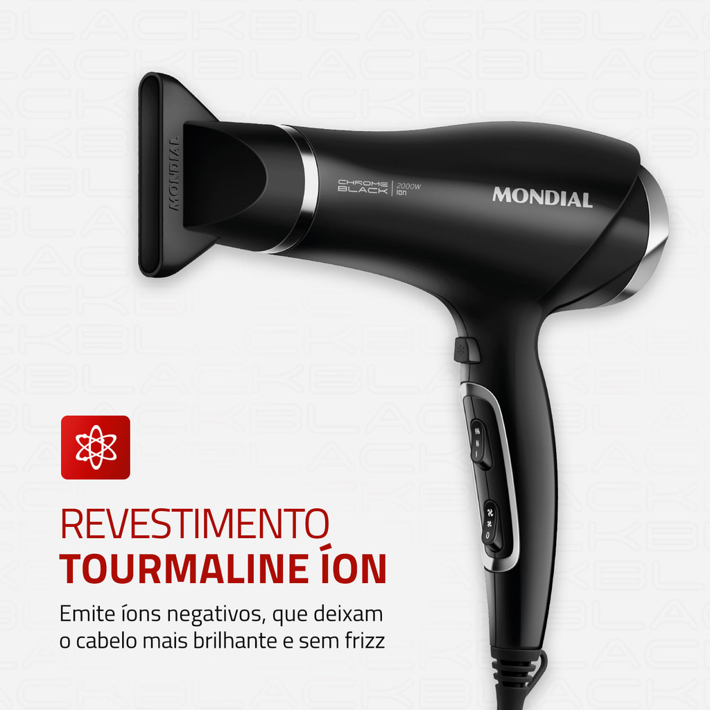 O secador Chrome Black SCN-04 da Mondial é garantia de cabelos secos com maciez e brilho! O revestimento com Tourmaline Íon emite íons negativos, que fecham as cutículas dos fios e reduzem o frizz. Já a alta potência, de 2000W, proporciona uma secagem rápida e eficiente. O secador possui 3 temperaturas, 2 velocidades e jato de ar frio: basta alternar entre as variações para uma secagem mais adequada ao seu tipo de cabelo. Saiba mais sobre o SCN-04 da Mondial: REVESTIMENTO COM TOURMALINE ÍON: Com o calor, o mineral emite íons negativos que fecham as cutículas dos fios e reduzem o frizz. Seu cabelo fica mais brilhante e macio! POTÊNCIA: 2.000W: Alta potência para uma secagem rápida e eficiente. 3 TEMPERATURAS + 2 VELOCIDADES: Alterne entre as variações de velocidade e temperatura para uma secagem mais adequada aos diferentes tipos de cabelo. JATO DE AR FRIO: O choque de temperatura no final da secagem reduz o frizz e ajuda a fixar a modelagem. GRADE DE CERÂMICA: A grade frontal, por onde sai o ar, tem revestimento cerâmico e distribui o calor de forma uniforme, minimizando os danos aos cabelos. BOCAL DIRECIONADOR: Concentra e direciona o fluxo de ar, proporcionando mais precisão e facilidade para modelar os fios. GRADE TRASEIRA REMOVÍVEL: Facilita a limpeza e aumenta a vida útil do secador de cabelo. CABO DE 1,8 METROS: O cabo-plugue tem 1,8 metros de comprimento, garantindo mais autonomia de movimento. UM ANO DE GARANTIA MONDIAL: A Mondial é a escolha de milhões de consumidores. Mondial, a escolha inteligente!
