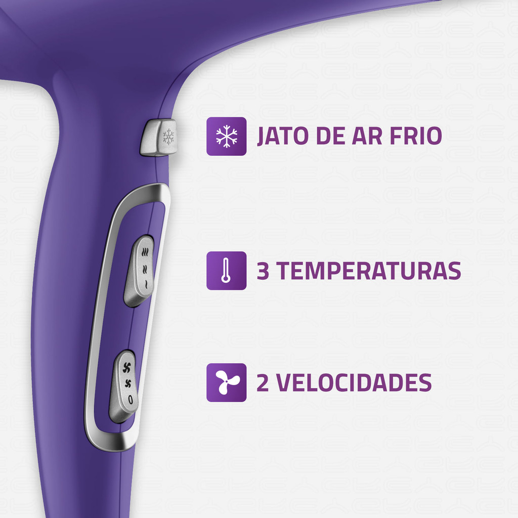 "O secador de cabelo Violet Grey SCN-05 da Mondial garante mais praticidade e eficiência à sua rotina de cuidados. Possui revestimento com Tourmaline Íon, que fecha as cutículas dos fios, aumenta o brilho e reduz o frizz. Além disso, o secador conta com 2.000W de potência, 3 temperaturas, 2 velocidades e jato de ar frio. Mais brilho e maciez aos seus cabelos da raiz até as pontas! Saiba mais sobre o SCN-05 da Mondial: REVESTIMENTO COM TOURMALINE ÍON: Com o calor, o mineral emite íons negativos que fecham as cutículas dos fios e reduzem o frizz. Seu cabelo fica mais brilhante e macio! POTÊNCIA: 2.000W: Alta potência para uma secagem rápida e eficiente. 3 TEMPERATURAS + 2 VELOCIDADES: Alterne entre as variações de velocidade e temperatura para uma secagem mais adequada aos diferentes tipos de cabelo. JATO DE AR FRIO: O choque de temperatura no final da secagem reduz o frizz e ajuda a fixar a modelagem. GRADE DE CERÂMICA: A grade frontal, por onde sai o ar, tem revestimento cerâmico e distribui o calor de forma uniforme, minimizando os danos aos cabelos. BOCAL DIRECIONADOR: Concentra e direciona o fluxo de ar, proporcionando mais precisão e facilidade para modelar os fios. GRADE TRASEIRA REMOVÍVEL: Facilita a limpeza e aumenta a vida útil do secador de cabelo. CABO DE 1,8 METROS: O cabo-plugue tem 1,8 metros de comprimento, garantindo mais autonomia de movimento. UM ANO DE GARANTIA MONDIAL: A Mondial é a escolha de milhões de consumidores. Mondial, a escolha inteligente!"