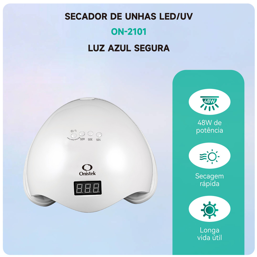 O Secador de Unhas LED/UV oferece alto desempenho e praticidade para o cuidado das unhas, garantindo uma secagem rápida e eficiente de esmaltes em gel e fortalecedores. Com potência de 48W e tecnologia de dupla luz (365+405 nm), proporciona uma cura uniforme sem zonas mortas, ideal para uso profissional ou doméstico. Equipado com 24 LEDs estrategicamente posicionados, o aparelho entrega excelente cobertura e longa durabilidade, com vida útil de até 50.000 horas. Possui modo de baixa temperatura que reduz o desconforto durante o processo, proporcionando mais conforto ao usuário. Seu design moderno e dimensões compactas otimizam o espaço e facilitam o uso em qualquer ambiente. ESPECIFICAÇÕES: - Potência: 48W - Alimentação: 127-220V AC / 60Hz - 1A - Dimensões: 220 x 195 x 105 mm - Fonte de luz: Dupla (365+405 nm) - Quantidade de LEDs: 24 unidades - Vida útil: 50.000 horas - Função: Modo de baixa temperatura para redução da dor CONTEÚDO: 01 Secador de Unhas LED/UV