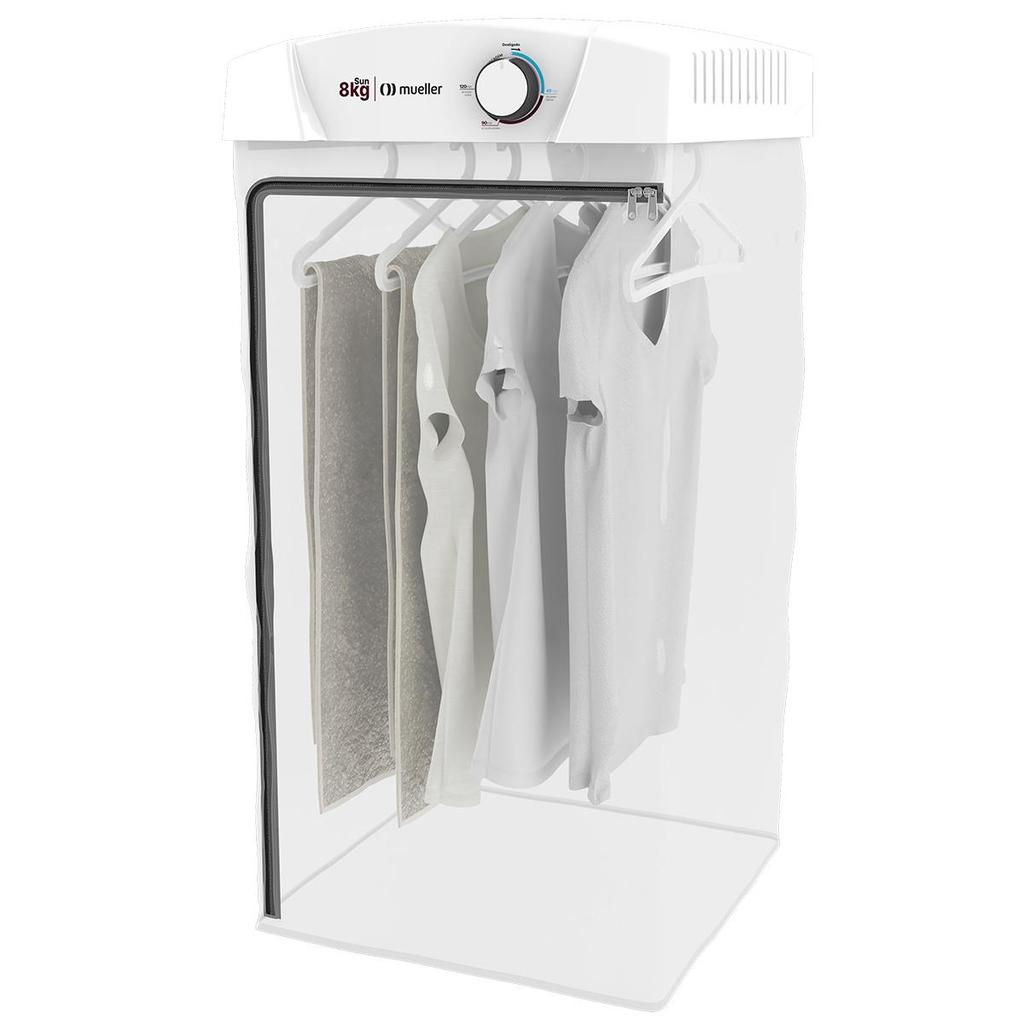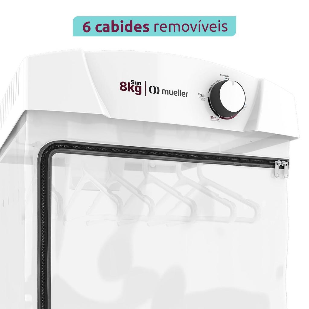 A Secadora de Roupas Sun é ideal para secar todos os tipos de roupa, com 6 cabides removíveis que deixam as roupas secas sem frisos e marcas indesejáveis. Com timer de até 120 minutos, Sistema Giro Fácil que permite que a secadora seja dobrada até a parede, ocupando ainda menos espaço da lavanderia. A câmara de secagem da Sun é feita em PVC, e é a maior da categoria, o que facilita a distribuição das roupas e garante uma melhor secagem. INFORMAÇÕES TÉCNICAS Altura (cm): 105cm Largura (cm): 50cm Profundidade (cm): 57cm Peso (Kg): 5,6Kg Timer: Timer de até 120 minutos Abertura: Zíper Aletas que reaproveitam ar quente: Sim Capacidade de Secagem - Roupa úmida (Kg): 8Kg Ciclo do timer (min): 45 a 120 minutos Tipo de Cabides: 6 cabides removíveis Câmara: Plástico especial IMPORTANTE A secadora acompanha um suporte para instalação na parede e sua caixa possui um gabarito impresso com a marcação exata onde deverá ser feita a furação. O ideal é instalar a uma altura de 1,6m a 1,8m do piso para maior comodidade e ergonomia. Recomendamos apenas a utilização de cabides originais Mueller na secadora, pois os mesmos são fabricados com um material adequado para a temperatura que a secadora atinge. Preservando o tecido das peças de roupa.
