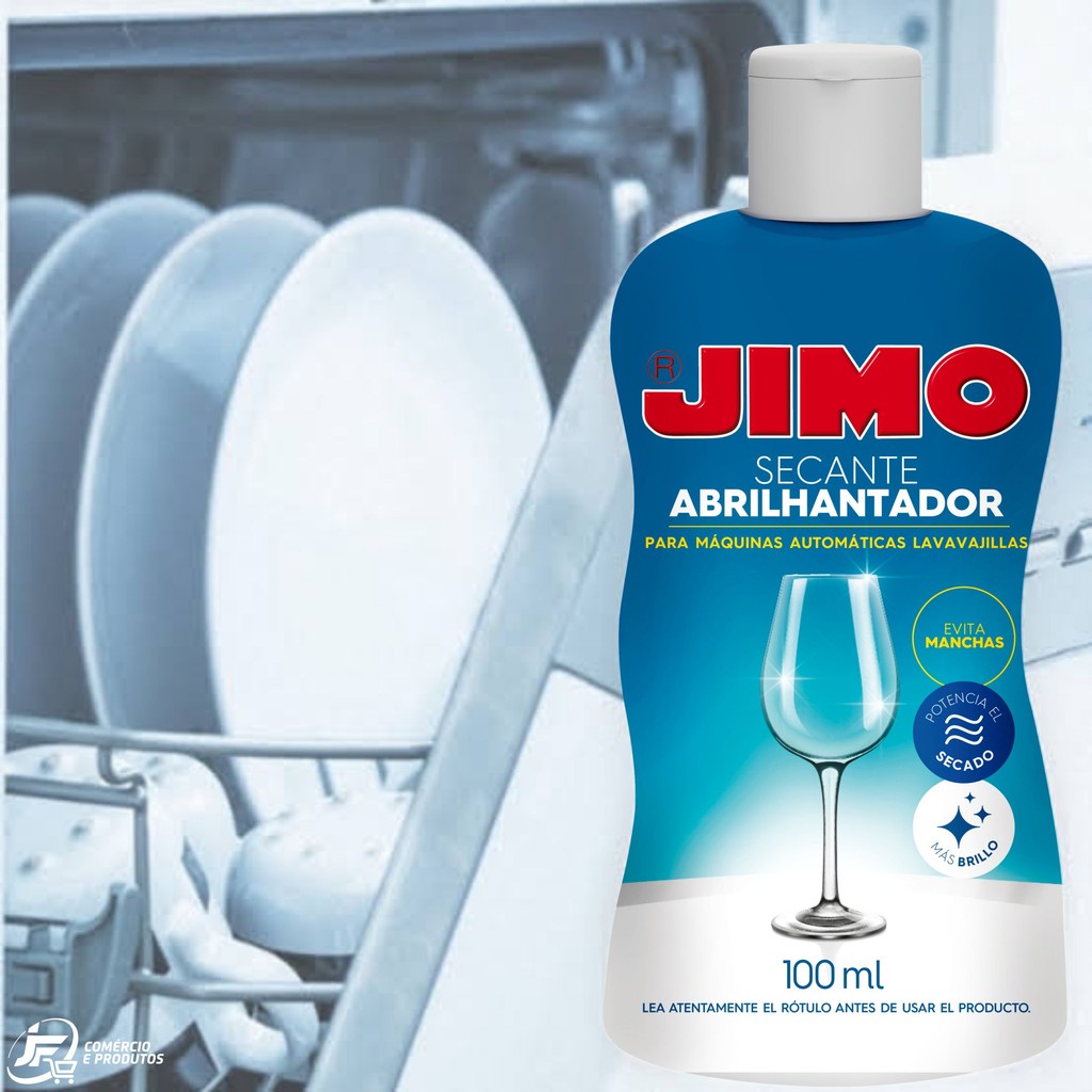 APLICAÇÕES: Confere brilho e ajuda na secagem das louças na máquinas de lavar louça. CARACTERÍSTICAS: JIMO SECANTE ABRILHANTADOR potencializa o processo de secagem das louças, evitando possíveis manchas e deixando-as com um brilho mais intenso. COMO USAR: Incline o frasco e pressione-o de forma que o jato seja direcionado para o reservatório. Siga as indicações do fabricante da máquina e verifique periodicamente se o reservatório está completo. APRESENTAÇÃO: Frasco com 250ml.