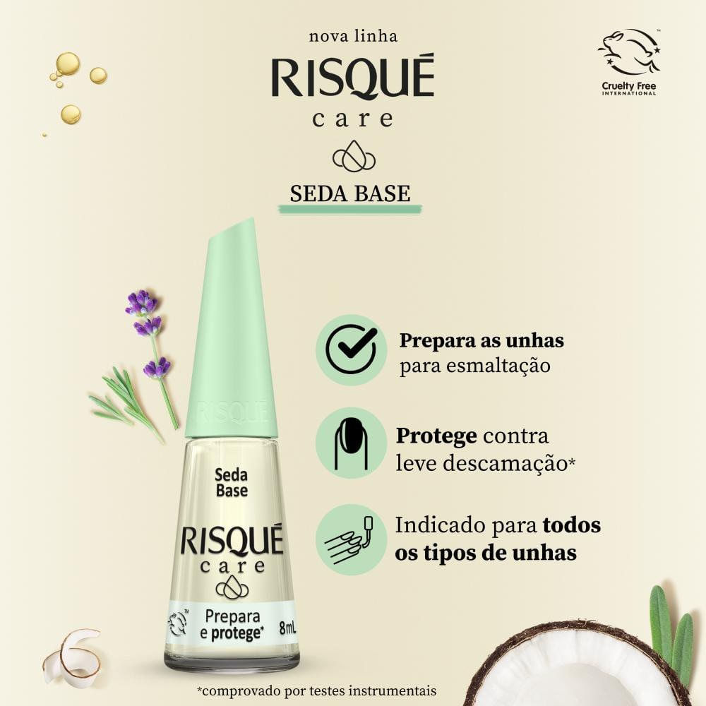 Esmalte Risqué Technology Seda Base 8mlOs Esmalte Risqué levam toda elegância, charme, suavidade e beleza das mulheres. Com alta cobertura, textura cremosa, brilho intenso e secagem rápida, os Esmalte Risqué não mancham durante a aplicação, tendo excelente durabilidade.