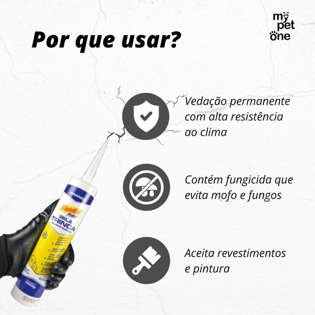 Sela Trinca Branco Mundial Prime – 450g O Sela Trinca Mundial Prime é um adesivo vedante acrílico de alta performance, ideal para reparos, acabamento e vedação de fissuras. Possui fácil aplicação, excelente aderência e alta resistência às intempéries, garantindo uma vedação duradoura e segura. Sua fórmula com fungicida impede a proliferação de fungos, mantendo a área protegida por mais tempo. Benefícios: Fácil aplicação e ótima aderência Vedação permanente com alta resistência ao clima Contém fungicida que evita mofo e fungos Pode ser lixado após a secagem Aceita revestimentos e pintura Ideal para trincas, fissuras e acabamentos Especificações: Produto: Adesivo vedante acrílico Cor: Branco Peso: 450g Indicação: Vedação e reparos em paredes, alvenaria e superfícies diversas Acabamento: permite lixa e pintura após aplicação