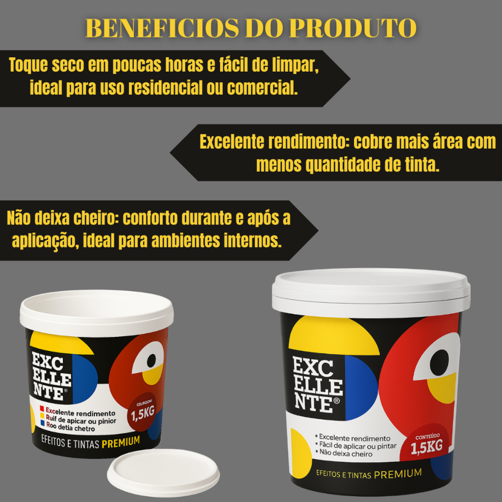 Selador Acrílico Excellente é um produto que prepara a superfície para receber a tinta, selando e uniformizando a absorção. Ele pode ser aplicado em paredes internas e externas, como de alvenaria, reboco, e gesso. Vantagens do Selador Acrílico: -Economiza tinta, pois reduz a absorção da superfície -Melhora a aderência da tinta -Evita problemas como desbotamento, manchas e descascamento -Proporciona um acabamento mais homogêneo e duradouro -Corrige imperfeições -Aumenta a fixação da pintura Como aplicar o selador acrílico: -Certifique-se de que a superfície esteja limpa e seca -Utilize um rolo, pincel, pistola ou trincha para espalhar o produto de maneira uniforme -Aguarde o tempo de secagem recomendado antes de aplicar a tinta de acabamento Rendimento: Aproximadamente 6 m2 (1 demão) Aplicação: Rolo, pincel, trincha, pistola. Diluição: De 5 a 10% com água limpa. Secagem: Ao toque e entre demãos 4 horas. Final 4 horas. Composição: Resina acrílica modificada, preservantes, aditivos, cargas minerais inertes, dióxido de titânio e água. Conteúdo: 900ML