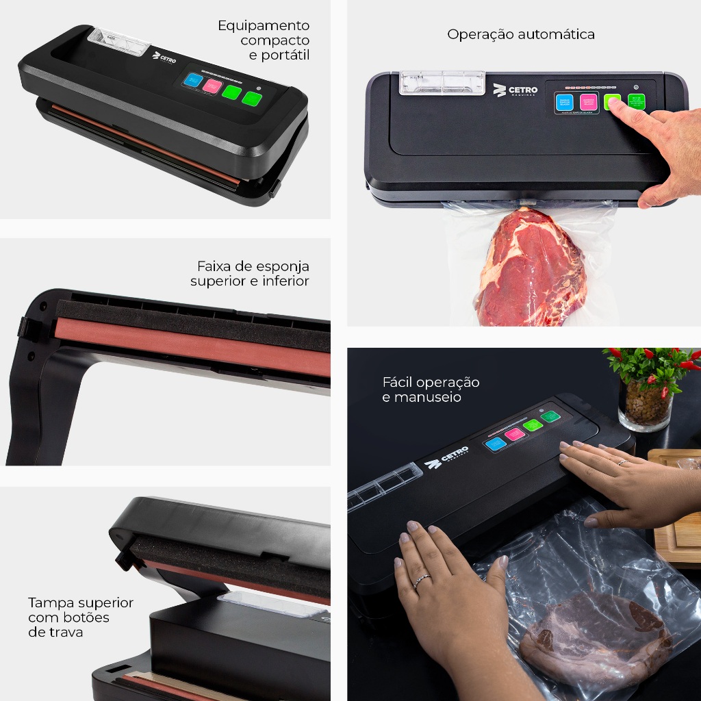 Seladora a Vácuo com Reservatório CPVS 290 R A Seladora a Vácuo com Reservatório CPVS 290 R é um equipamento automático de uso doméstico e comercial projetado para embalar a vácuo alimentos úmidos ou que contenham líquidos. Com estrutura portátil e design exclusivo, sua tecnologia a vácuo e sistema de reservatório de líquidos permitem que os produtos sejam armazenados e conservados por muito mais tempo, prolongando seu frescor e evitando contaminações. FACIL UTILIZAÇÃO Essa Seladora possui painel digital de ajustes simples de acordo com a quantidade de alimento e embalagem utilizada, que torna sua utilização intuitiva e prática. Após as configurações, basta apertar um botão para que a máquina realize os processos de vácuo e selagem de forma rápida, agilizando a produção e assegurando uma embalagem perfeitamente selada. PRATICIDADE E ECONOMIA NA COZINHA Esse modelo de Seladora com Reservatório facilita o processo de armazenamento de alimentos e a conservação de produtos in natura, proporcionando uma forma mais prática de organizá-los em pequenas e médias porções. AJUSTES PRÁTICOS O tempo de vácuo pode variar de acordo com o volume de produto embalado e o tempo de selagem pode ser ajustado entre 1,5 e 15,5 segundos, conforme a espessura da embalagem utilizada. USO DE EMBALAGENS LISAS A CPVS 290 R é um equipamento prático e de bancada que atende a demanda de embalagens lisas de tamanhos e espessuras variadas, com largura de até 290 mm. As Embalagens Lisas da Cetro, específicas para vácuo, não possuem ranhuras, seguem um padrão de qualidade internacional, são econômicas e fáceis de utilizar, garantindo uma vedação eficaz e segura. DIVERSIDADE DE APLICAÇÃO A Seladora Vácuo é uma solução surpreendente que traz praticidade a pequenos negócios ao embalar produtos que possuem líquidos, como carnes, peixes, legumes, espetinhos, palmitos, frios fatiados, aves, conservas, queijos, comidas congeladas, molhos e muito mais. OTIMIZE SUA PRODUÇÃO COM OUTROS MAQUINÁRIOS A Seladora a Vácuo com Reservatório CPVS 290 R pode ser utilizada com outras soluções Cetro, como Dosadoras, Termocirculadores e Datadores, garantindo a otimização contínua dos processos de embalo de seu negócio. Para saber mais e sanar qualquer tipo de dúvida sobre o maquinário, entre em contato com os especialistas da Cetro em nossos canais de comunicação. ESPECIFICAÇÕES TÉCNICAS Modelo: CPVS 290 R Tensão: 220V / 50Hz Embalagem compatível: Apenas embalagens lisas Tempo de selagem: 1,5 a 15 segundos Tempo de vácuo contínuo: 60 segundos Barra de selagem: 290mm Área útil de selagem: 275mm Pressão de vácuo: 0,08 MPa Potência: 220 W Dimensões da máquina (C x L x A): 43 x 12 x 20 cm Peso: 2,3 kg