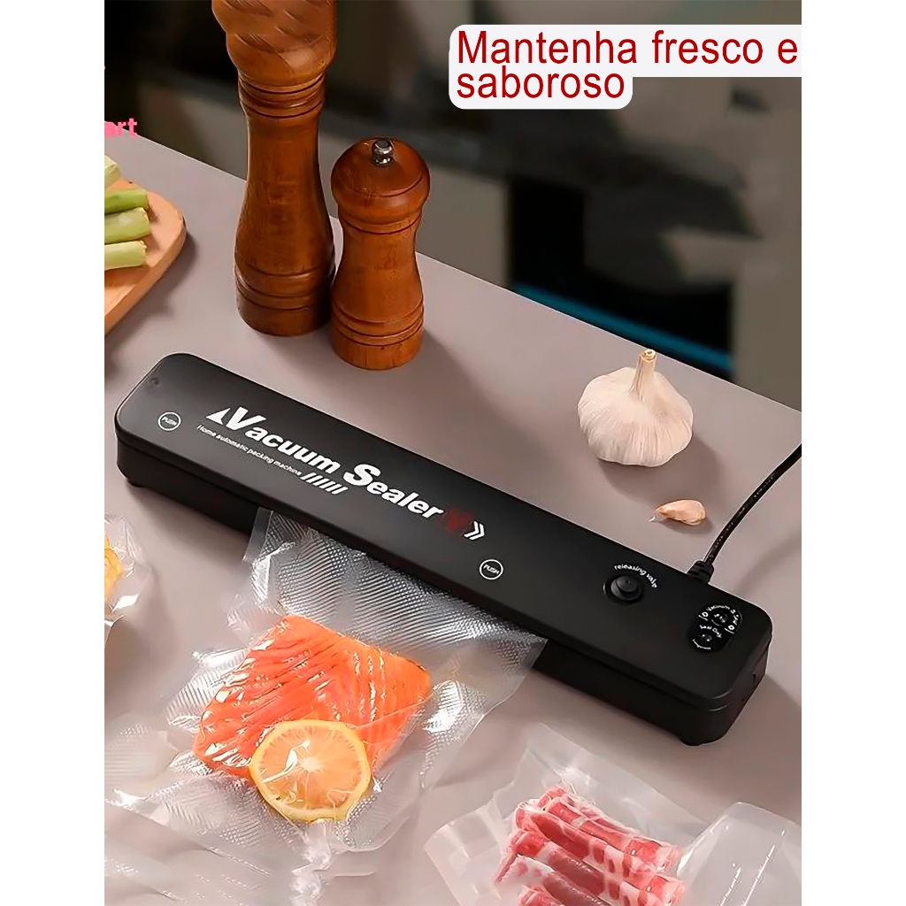 Descrição do produto "Apresentando a Seladora a Vácuo de Alimentos Bivolt: sua solução para manter produtos frescos por até 5 vezes mais tempo! Compacta, eficiente e fácil de usar, essa ferramenta poderosa cria um ambiente selado que reduz a deterioração, sendo ideal para alimentos secos e uma variedade de itens, como roupas, acessórios e joias. **Especificações Técnicas:** - Material: ABS - Potência: 90W - Velocidade de vedação: 3 - 8 s - Tamanho mínimo do saco: 14 cm - Tamanho máximo do saco: 29 cm - Voltagem: Bivolt 110v / 220v (50-60Hz) Com 90W de potência, esta seladora é energeticamente eficiente e seu design compacto se adapta a qualquer espaço. Seja para uso doméstico ou comercial, essa seladora é a escolha perfeita para prolongar a vida útil dos produtos, reduzindo o desperdício e garantindo frescor. **Benefícios:** - Economiza tempo ao preparar refeições com antecedência - Sela alimentos secos em sua embalagem original - Design compacto economiza espaço - Protege contra bactérias e fungos - Protege fotos e documentos Além disso, ao adquirir a Seladora a Vácuo Bivolt, você receberá: 01x - Seladora a Vácuo; 10x - Embalagens/Sacos para selar a vácuo (25cm x 17cm)."