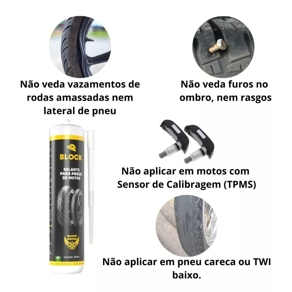 1 FRASCO DE BLOCK SELANTE - PNEUS MOTO Principais caraterísticas: - O selante de Pneus Block Motos é uma nova tecnologia preventiva contra furos, que age na banda de rodagem do pneu, o selante deve ser instalado no pneu antes de ser furado; - Sua eficiência foi comprovada em furos causados por objetos perfurantes de até 2,5 milímetros em pneu com câmara ( câmara nova ou em bom estado sem nenhum reparo anterior ), e 4,5 milímetros em pneu sem câmara; - O produto deve ser aplicado antes de o pneu furar! Com o produto aplicado, ocorrendo um furo no pneu, desde que o tamanho do objeto perfurante esteja dentro dos limites especificados, a perda de pressão será minimizada e em poucos segundos se estabilizará, vedando o pneu definitivamente, não sendo necessário fazer nenhum tipo de reparo posterior ou substituição de câmara; - Ocorrendo furos maiores que os especificados pelo produto, desde que não sejam rasgos que possam danificar a estrutura do pneu, constatamos que o selante pode retardar a perda de pressão de ar, permitindo em muitos casos, que a motocicleta seja conduzida com segurança até um local onde o pneu possa ser reparado; - A avançada tecnologia deste produto combina uma solução a base de água, glicóis com pequenas borrachas orgânicas, adesivos inibidores de corrosão hidratando o pneu e a malha de aço; - Sua fórmula foi projetada para se manter sempre homogênea e sempre pronto a trabalhar por você; - O selante de pneus é um produto thixotrópico, ou seja, quando o pneu está em movimento o gel torna-se mais líquido, em contrapartida, na medida em que o pneu cessa o movimento, o gel torna-se menos líquido, o que ajuda a mantê-lo espalhado pela banda de rodagem; - Block Motos de pneu é um produto de avançada tecnologia que oferece segurança, economia a todos os motociclistas, independente do estilo de moto ou utilização; - Ocorrendo um furo o gel imediatamente impedirá a perda de pressão de ar, o gel vedará o pneu definitivamente, não necessitando de reparos posteriores; Como aplicar o Block Selantes: - Com um saca válvula, retire a válvula do bico do pneu para esvaziá-lo completamente; - Corte a ponta do frasco e encaixe o bico de aplicação, que acompanha o produto, rosqueando-o até travar; - Em seguida, encaixe a mangueira de aplicação no bico do pneu até que esteja firmemente encaixado; - Injete o frasco completo no pneu, lembrando que sempre será utilizado 1 frasco por pneu; - Após aplicação do produto e antes de recolocar a válvula, limpe o bico do pneu com um jato de ar comprimido para remover resíduos do gel e calibre normalmente os pneus; - Siga sua viagem com tranquilidade e com toda a segurança que você merece; - Frasco com 300 ml de selante ( utilizar 1 frasco por pneu ); - Fabricante: Block Selantes;