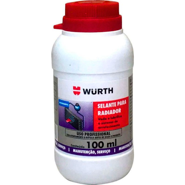 SELANTE VEDA RADIADOR WURTH 100ML DESCRIÇÃO: Selante Veda Radiador Wurth é um produto a base de fibras para lubrificar e vedar pequenos furos do sistema de arrefecimento. Pode ser usado preventivamente e corretivamente. O Selante Veda Radiador Wurth é um produto muito bom para mander guardado dentro do veículo, exemplos: - Quando necessitamos usar o veículo que está vazando água e não podemos parar para manutenção. - Quando estamos em viagem e o veículo começa a perder água e não podemos esperar o guincho. - Quando o veículo está perdendo água mais ninguém consegue descobrir a origem do vazamento. MODO DE USO: 1. Com o motor a frio e desligado, drene cerca de 1L do líquido refrigerante do sistema para permitir a adição do produto 2. Agite o produto 3. Com o motor funcionando em marcha lenta, adicione vagarosamente o líquido no radiador ou, no caso de sistema selado, no reservatório auxiliar 4. Complete o líquido do sistema e recoloque a tampa 5. Acelere moderadamente até consolidar a obstrução do vazamento