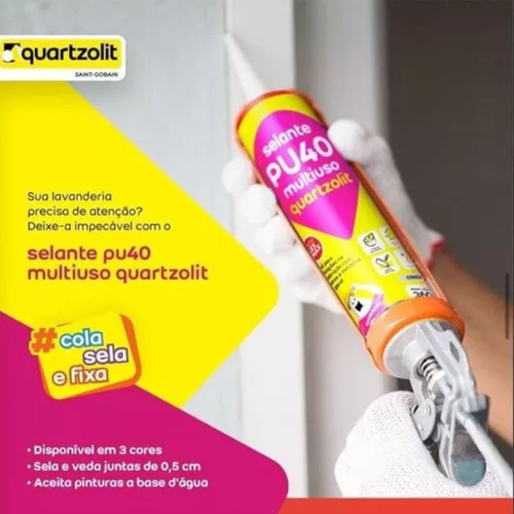 O selante PU40 multiuso Quartzolit é um produto monocomponente à base de poliuretano que possui excelentes propriedades físicas e mecânicas, podendo ser usado em diversas aplicações da construção civil, industrial e residencial de pequenos reparos. • Adesão coesiva em diversos substratos lisos ou porosos; • Aplicável em superfícies úmidas; • Fácil aplicação, alta durabilidade e resistência química; • Aplicações em junta vertical e horizontal até 0.5 cm, para estruturas ou painéis pré-fabricados em concreto; • Vedação perimetral de vidros e esquadrias de alumínio; • Juntas de vedação de granito, concreto, vedação de cubas, madeira e superfícies metálicas; • Selagem de container, câmara frigorífica e carroceria; • Aceita aplicação de pinturas base água. CONTRA INDICADO PARA: • Contato direto com alimentos; • Coberturas e telhados com aplicação menor que 5mm de espessura; • Adesão estrutural; • Juntas de dilatação; • Não há adesão em polietileno, polipropileno e PTFE (Teflon®)...