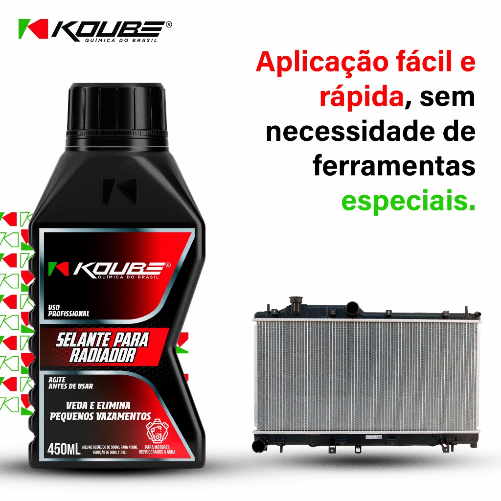 Selante para Radiador Selante Para Radiador Koube é uma composição química exclusiva, que possui ação imediata após os 65ºC no sistema de arrefecimento, desenvolvida para eliminar pequenos vazamentos em caráter emergencial. CARACTERÍSTICAS Elimina pequenos vazamentos; Ação imediata, após atingir a temperatura de 65ºC; INSTRUÇÕES DE USO Com o motor do veículo frio, remova a tampa do reservatório do sistema de arrefecimento. Agite bem a embalagem e adicione todo o conteúdo do frasco no reservatório. Complete o reservatório até o nível máximo indicado pelo fabricante do veículo. Ligue o veículo e aguarde até que o eletroventilador seja acionado por 3 vezes. Em seguida desligue o veículo e certifique-se de que não haja mais vazamentos. Se persistirem os vazamentos, procure uma oficina mecânica de sua confiança. É indicado para ser utilizado em caráter corretivo, em sistemas de arrefecimento que apresentem pequenos vazamentos. Não é recomendado o uso preventivo, junto a solução arrefecedora, principalmente em veículos acima de 2015, pois os tubos do radiador são extremamente finos podendo haver obstrução do mesmo. PRECAUÇÕES Em contato com a pele ou olhos lavar com água em abundância. Se inalado em excesso remova a pessoa para um local ventilado. No caso de ingestão não provoque vômito, procure assistência médica imediatamente. Em caso de emergências entre em contato com CEATOX 0800 41014. MANTER FORA DO ALCANCE DE CRIANÇAS E ANIMAIS DOMÉSTICOS. Produto inflamável e envasado sob pressão. Manter longe de chamas e superfícies aquecidas. Não perfure a embalagem. Não expor a temperaturas superiores a 50°C. Não reutilize a embalagem. COMPOSIÇÃO Tensoativos não iônicos, água desmineralizada, conservantes e polímeros sintéticos.