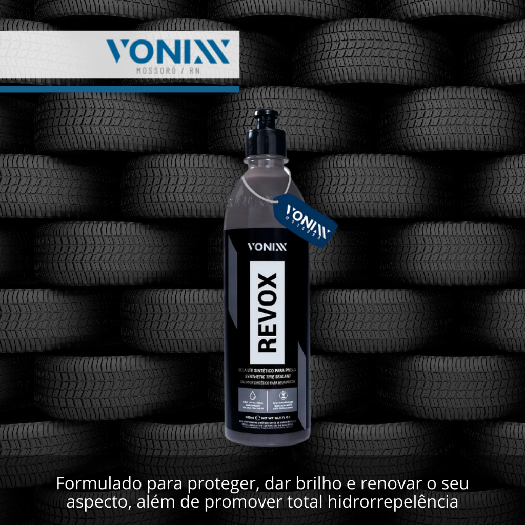 REVOX VONIXX 500ml - SELANTE PARA PNEUS.....................................................................................................................................INFORMAÇÕES SOBRE O PRODUTO.....................................................................................................................................REVOX é um selante sintético para pneus, formulado para proteger, dar brilho e renovar o seu aspecto, além de promover total hidrorrepelência. Sua fórmula exclusiva é livre de solventes, ecologicamente correta e não inflamável. REVOX é extremamente resistente à lama e chuva, deixando o pneu limpo por mais tempo......................................................................................................................................ESPECIFICAÇÕES DO PRODUTO.....................................................................................................................................DILUIÇÃO:Pronto usoDURABILIDADE:Até 45 diasINFORMAÇÕES ADICIONAIS:Não recomendamos aplicar Revox em partes plásticas.NÃO SAI NA ÁGUAALTA DURABILIDADEMÁXIMO RENDIMENTODISPONÍVEL EM: 500ML E 1,5LMODO DE USAR:Limpe bem os pneus;Com ajuda de uma espuma aplicadora ou aplicador específico para pneus, aplique o produto de maneira uniforme, garantindo total cobertura, sem falhas;Observe o nível de brilho. Se desejar um resultado mais brilhante, realizar nova aplicação após 5 minutos.Obs: O nível de brilho pode ser regulado também de acordo com a quantidade de produto aplicado: quanto mais produto, mais brilho. Caso opte por acabamento com menos brilho, aplicar quantidade reduzida de Revox......................................................................................................................................DÚVIDAS FREQUENTES.....................................................................................................................................Pergunta: Como é embalado o produto?Resposta: Todos os nossos produtos vendidos são embalados em caixas lacradas ou plástico stretch. Em respeito ao meio ambiente 90% das caixas são reutilizadas.Pergunta: Quem faz a entrega?Resposta: A entrega é terceirizada, feita via CORREIOS ou TRANSPORTADORA.Pergunta: O envio é feito em quantos dias?Resposta: Nós enviamos o seu pedido no prazo máximo de 24 horas após a confirmação de sua compra, sendo um dos envios mais rápidos da plataforma.Pergunta: Os produtos são novos ou usados?Resposta: Todos os produtos que trabalhamos são novos e com qualidade garantida......................................................................................................................................