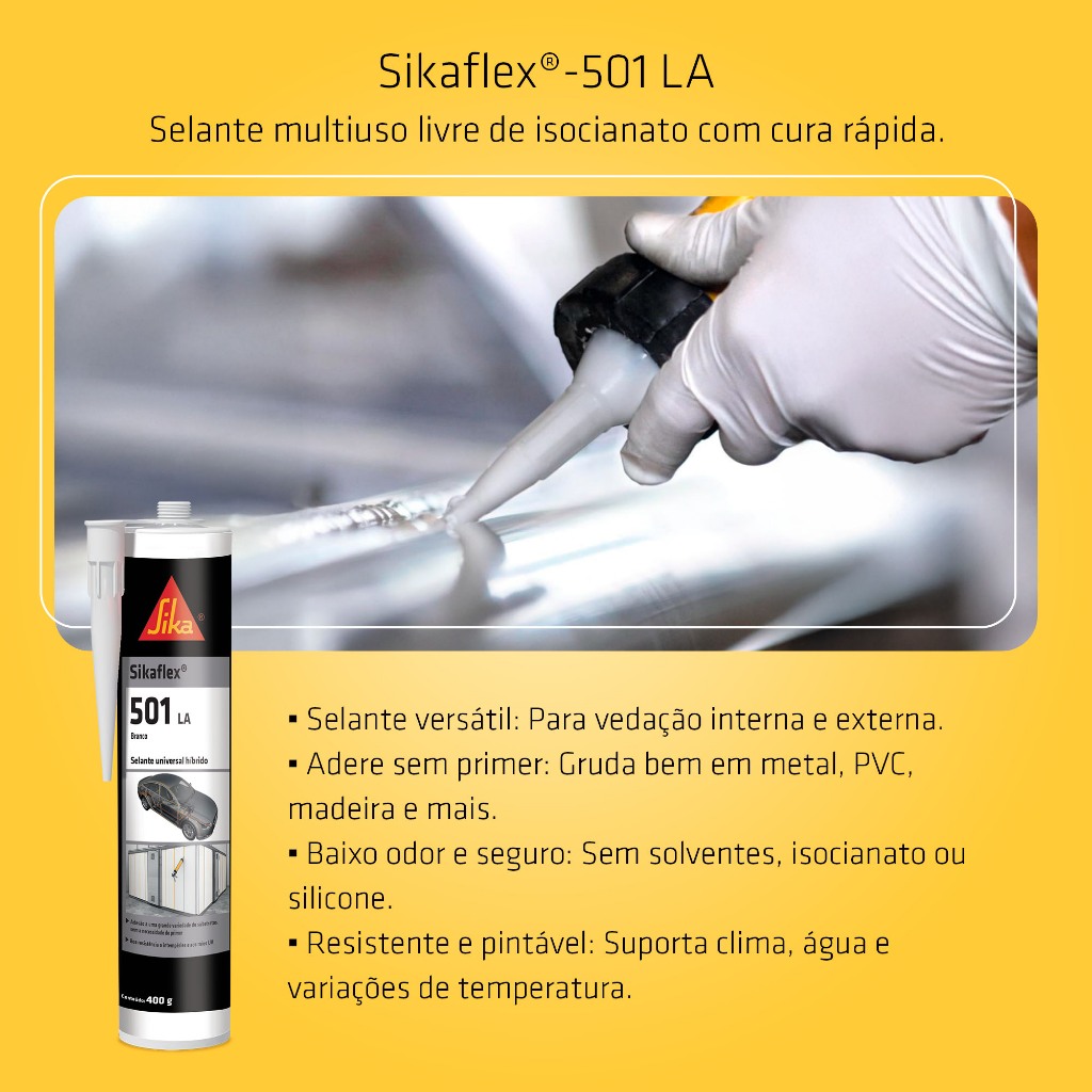 SIKAFLEX®-501 LA - SELANTE USO GERAL / AUTOMOTIVO / VEDAÇÃO - BRANCO, CARTUCHO 400G | SIKA O Sikaflex®-501 LA é um selante monocomponente de alta performance, desenvolvido com polímero terminado em silano (STP), que cura ao entrar em contato com a umidade atmosférica. Ideal para diversas aplicações internas e externas, este produto é a escolha perfeita para quem busca eficiência e qualidade. Características Principais: - Base Química: Polímero terminado em silano - Cor: Branco - Mecanismo de Cura: Cura por umidade - Tempo de Formação de Película: Aproximadamente 20 minutos Benefícios do Produto: - Rápida Formação de Película: Permite agilidade nas aplicações. - Excelente Adesão: Adere bem a uma ampla variedade de substratos, como metais, PVC, PRFV e madeira, sem necessidade de pré-tratamento especial. - Baixo Odor: Confortável para uso em ambientes fechados. - Livre de Solventes e Isocianato: Seguro para o usuário e o meio ambiente. - Versatilidade: Ideal para a maioria das aplicações de vedação industrial. Áreas de Aplicação: - Vedação em construções civis - Aplicações automotivas - Montagem de janelas e portas - Vedação de telhados e calhas - Indústria de móveis e decoração Instruções de Aplicação: - Preparação da Superfície: As superfícies devem estar limpas, secas e livres de graxa, óleo e poeira. - Aplicação: Utilize pistolas manuais, pneumáticas ou elétricas. - Pintura: O selante pode ser pintado após a formação da película. Embalagem: Cartucho de 400g