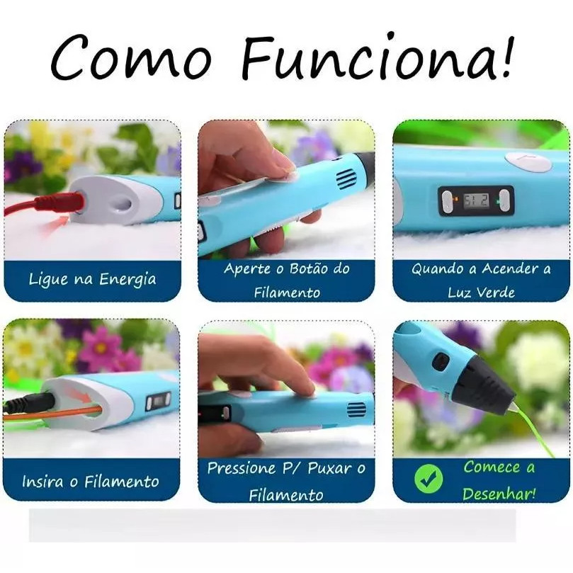 Caneta Impressora 3D Com Kit De Filamento 9M Desenhos 3D A Caneta Impressora 3D com Kit de Filamento 9M é a ferramenta ideal para estimular a criatividade e a imaginação, além de ser útil para reparos em objetos plásticos. Transforma desenhos em papel em realidade 3D, proporcionando uma experiência única e divertida. Design ergonômico e leve, fácil de manusear com controlador de velocidade. Bico de 0.7mm e utiliza filamento de 1,75mm, garantindo durabilidade e facilidade na troca de filamento. Temperatura de aquecimento ajustável, de 160 a 230 graus Celsius. Painel LED de temperatura com luz auxiliar indica quando está pronta para uso. Especificações técnicas: - Bico: 0.7mm - Filamento: 1,75mm - Velocidade de saída de filamento ajustável - Temperatura de aquecimento: 160 a 230 graus Celsius - Material: tampa da caixa de plástico - Método de moldagem: moldagem 3D - Área de impressão: ilimitado - Dimensões: 187x44x30mm - Peso: 325g O kit inclui: - 1x Caneta de Impressão 3D - 1x Suporte para Caneta - 3x Filamento 1.75mm (cores variadas) aproximadamente 3 metros cada - 1x Manual do Usuário - 1x Cabo USB Modo de uso: 1. Conecte o cabo USB na extremidade da caneta. 2. Escolha o tipo de plástico (ABS ou PLA) no painel. 3. Insira o filamento plástico na extremidade da caneta. 4. O filamento será automaticamente puxado pela caneta. 5. Aguarde o aquecimento automático da caneta. 6. Quando a caneta estiver pronta, a luz verde do painel LED acenderá. 7. Cuidado com a ponta da caneta, pois estará quente. 8. Utilize para criar desenhos em 3D. ✅🟩 ⁉️Sem caneta-10 cores, 50 metros:Sem caneta, sem caneta.⁉️-NO caneta A Caneta Impressora 3D com Kit de Filamento 9M é ideal para estimular a criatividade, aprendizado e diversão, além de ser útil para reparos em objetos plásticos. Seu design ergonômico e facilidade de uso a tornam uma excelente escolha para diversas aplicações.