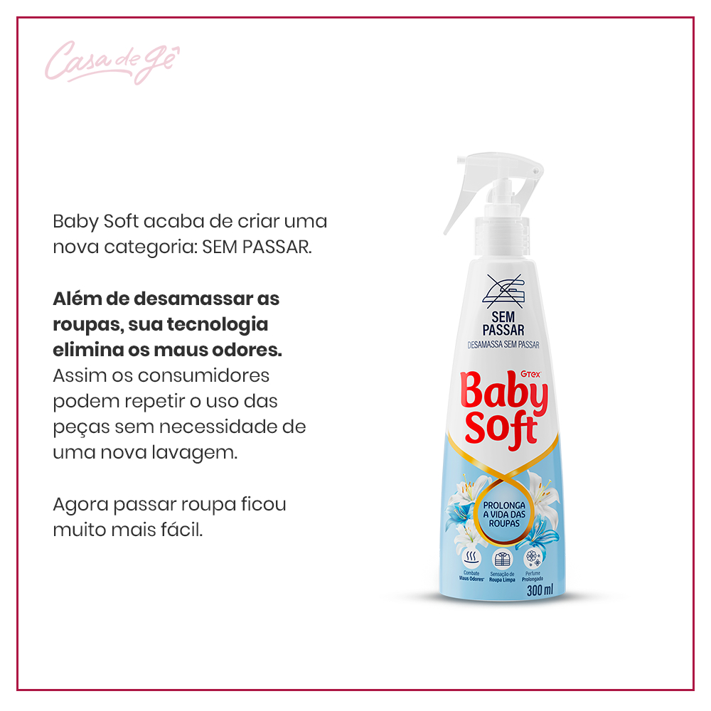 O Sem passar Baby Soft é prático, moderno e inteligente, também conta com tecnologia exclusiva Infinity Care. Dê adeus ao ferro de passar e aproveite roupas limpas, cheirosas e desamassadas em um spray. É só borrifar, esticar com as mãos e pronto: roupas desamassadas, perfumadas e prontas para usar. 1.Vantagens O Sem passar Baby Soft é prático, moderno e inteligente. É só borrifar, esticar com as mãos e pronto: roupas desamassadas, perfumadas e prontas para usar. O novo Sem Passar Baby Soft também conta com tecnologia exclusiva Infinity Care. Dê adeus ao ferro de passar e aproveite roupas limpas, cheirosas e desamassadas em um spray. Tenha sempre à disposição na sua lavanderia o Sem Passar Baby Soft! 2.Características do produto (medidas/especificar quando houver variação do mesmo produto) Confira a fórmula com 8 benefícios Infinity Care 1. Desamassa sem passar: remove os vincos das roupas, sem necessidade de utilizar o ferro de passar; 2. Perfumação prolongada: inspirada em perfumaria fina; 3. Testado dermatologicamente e hipoalergênico; 4. Sensação de roupa limpa: refresca o tecido; 5. Reduz lavagens desnecessárias: evita excessivas lavagens, economizando água, produto de limpeza e ritmo; 6. Combate maus odores: tecnologia com moléculas que neutralizam o mau cheiro; 7. Roupas mais macias: confere maciez aos tecidos; 8. Conserva as roupas por mais tempo: oferece maior durabilidade para as peças de roupa. Detalhes técnicos: Unidade: Embalagem com Sem Passar Baby Soft - 300ML Dimensões da embalagem: 24cm(L)x 4cm(P)x7,1cm(A) Vida útil: 24 meses 3.Composição (do que é feito o produto)/ Especificações técnicas Polidimetilsiloxano Tensoativo Não Iônico Coadjuvante Acidificante Fragrância Conservante Veículo Características do Produto 4. Modo de usar (o da embalagem) O Sem Passar Baby Soft é fácil e simples de usar. Sua aplicação acontece em apenas quatro etapas: 1 - Pendure a roupa em um cabide e estique suavemente; 2 - Mantenha a embalagem na posição vertical e aplique o produto uniformemente, mantendo uma distância de 30cm; 3 - Para ajudar na remoção de vincos da roupa, use as mãos para esticar e alisar a superfície do tecido; 4 - Aguarde a secagem da roupa por alguns minutos e está pronta para o uso. 5. Dica de Gê Vai viajar? Não esqueça de levar o Sem Passar Baby Soft na mala de viagem! Ele te ajuda proporcionando praticidade pra você passar mais tempo com a sua família, sem deixar de lado o cuidado e o carinho com as roupas. O Sem Passar Baby Soft, além de desamassar as roupas, tem tecnologia para eliminar os maus odores e é o parceiro perfeito para a sua viagem! Dê adeus ao ferro de passar e aproveite roupas limpas, cheirosas e desamassadas em um spray: a praticidade que você consegue levar para onde for!