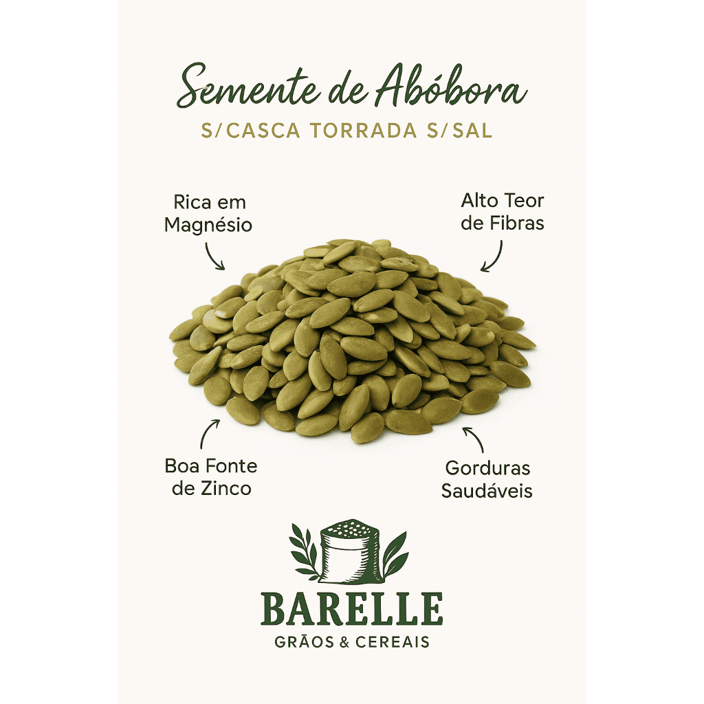Barelle – A essência da pureza em cada detalhe Grãos e temperos cuidadosamente selecionados para quem valoriza autenticidade, qualidade e sofisticação à mesa. Entre em contato e descubra como a Barelle pode transformar seus sabores em experiências únicas. Todos os nossos produtos estão disponíveis para pronta entrega. Semente de Abóbora Torrada S/Casca S/Sal Barelle 1KG Sementes de abobora sem casca torrada sem sal são conhecidas principalmente pelo elevado teor proteico e de óleo. COMPOSIÇÃO: Semente de abobora sem casca. NÃO CONTÉM GLÚTEN