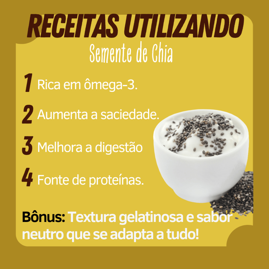 Semente de Chia Premium A Semente de Chia Premium é selecionada grão a grão, garantindo pureza máxima e alto poder nutricional. Com capacidade de absorção 12 vezes superior ao seu peso, cria um gel natural que melhora texturas e potencializa benefícios em qualquer preparação. Diferencial Exclusivo: processo de limpeza tripla e 100% de aproveitamento nutricional - mantendo intactos seus ômegas, fibras e minerais. Apresentada em embalagem ultra-protegida de 500g para máxima conservação. 💎 Benefícios que Fazem Diferença: ✔ Fonte vegetal mais rica em Ômega-3 ✔ Regulação intestinal natural e suave ✔ Proteína completa para dietas veganas ✔ Cálcio biodisponível para ossos fortes ⚡ Potência nutricional da natureza em cada colher!