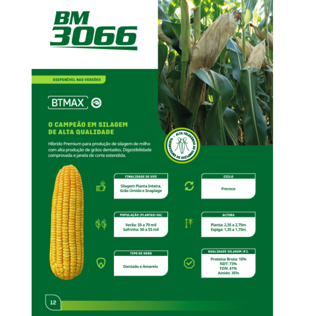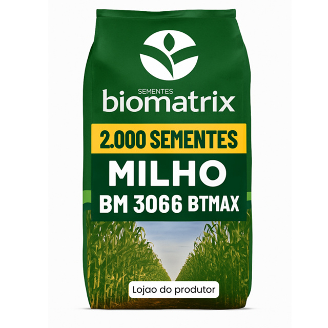 2 mil Sementes de Milho para milho Verde e silagem 3066 BTMAX Fortis NDB R1 O peso do pacote pode variar, mas sempre vem 2 mil sementes Produtores enfrentam desafios na qualidade da silagem e no combate às lagartas, comprometendo a produtividade e a rentabilidade. Apresentamos a Semente de Milho Biomatrix BM 3066 BTMAX FORTIS NDB R1, a solução definitiva para quem deseja silagem de alta qualidade. Desenvolvida em parceria com a Embrapa, essa variedade precoce possui uma biotecnologia inovadora, com a proteína Cry1Da, que combate eficientemente as lagartas. Ideal para diversas aplicações como silagem de planta inteira, grão úmido e snaplage, o BM 3066 se destaca por sua excelente arquitetura semiereta e alta capacidade de empalhamento. Benefícios: - Ciclo Precoce: Acelera o tempo de colheita. - Altíssima Qualidade de Silagem: Proteína bruta de 10% e NDT de 73,2%. - Resistência a Pragas: Biotecnologia que garante menor perda na colheita. Especificações Técnicas - Tipo de Grão: Dentado, Amarelo - Altura da Planta: 2,35 a 2,75m - Altura da Espiga: 1,35 a 1,75m - População Recomendada: - Verão: 55 a 70 mil plantas/ha - Safrinha: 50 a 55 mil plantas/há - Qualidade de Silagem (Planta Inteira): - Proteína Bruta: 10,0% - NDT: 73,2% - FDN: 41,6% - Qualidade de Silagem (Grão Úmido): - Amido: 72,8% - Proteína Bruta: 8,0% - E.ET: 4,4% RESISTENTE A GLUFOSINATO! Agradecemos pela sua visita!