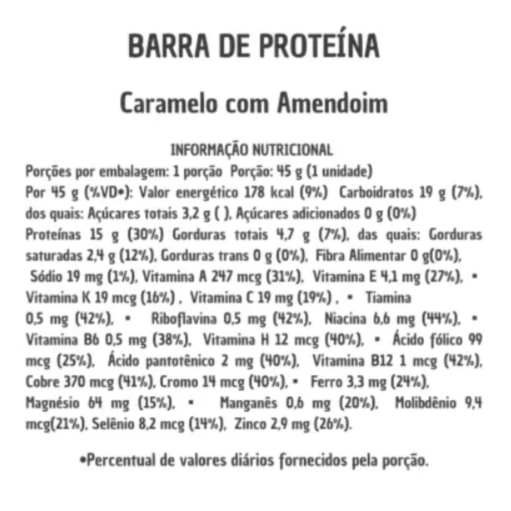 Sobre o produto: Sense Whey Bar é uma barra de proteína desenvolvida pela Absolut Nutrition que combina nutrição avançada com sabor marcante. A versão Caramelo com Amendoim oferece 15g de proteína por unidade, aliada a um blend exclusivo de 13 vitaminas e 11 minerais, sendo uma excelente opção para quem busca uma alimentação prática e equilibrada. Ideal para o consumo no pré ou pós-treino, lanches intermediários ou qualquer momento do dia, essa barra se destaca por seu sabor indulgente e por ser adoçada naturalmente com Stevia. Como consumir - Consumir uma barra ao dia ou conforme orientação de nutricionista ou médico. - Pode ser ingerida entre as refeições, como lanche rápido, ou próxima aos treinos, de acordo com as necessidades nutricionais individuais. Benefícios - 15g de proteína por unidade - Contém 13 vitaminas essenciais - Fornece 11 minerais importantes para o organismo - Adoçada com Stevia, sem adição de açúcares refinados - Sabor indulgente de caramelo com amendoim - Prática e ideal para o dia a dia - Contribui para a manutenção da massa muscular - Pode auxiliar no aporte nutricional de vitaminas e minerais Alergênicos - Contém leite, amendoim, soja e derivados. - Pode conter avelã, amêndoa, castanha-do-pará, castanha-de-caju, nozes, pistache, macadâmia, pecã, ovo, trigo, centeio, cevada e aveia. Ingredientes: Proteína concentrada do soro do leite, colágeno hidrolisado, cobertura sabor chocolate branco sem adição de açúcares (gordura vegetal, leite em pó, maltitol, cacau, emulsificante lecitina de soja, aromatizante), caramelo, pasta de amendoim, fibras alimentares, cacau em pó, minerais (cálcio, magnésio, ferro, zinco, manganês, cobre, selênio, cromo, molibdênio, iodo, potássio, fósforo), vitaminas (A, D, E, C, B1, B2, B3, B5, B6, B7, B9, B12), aromatizantes, edulcorantes (maltitol e glicosídeos de esteviol – Stevia) e emulsificantes. Advertências - Este produto não substitui uma alimentação equilibrada e seu consumo deve ser orientado por nutricionista ou médico. - Pode haver variação de cor e sabor entre os lotes. - Conservar em local seco, fresco e ao abrigo da luz. Conclusão: Sense Whey Bar Caramelo com Amendoim é a escolha ideal para quem busca praticidade, sabor e nutrição em um único produto. Com alto teor proteico, adoçante natural e um perfil vitamínico e mineral completo, essa barra se adapta perfeitamente à rotina de quem deseja cuidar do corpo sem abrir mão do prazer em comer. Uma solução nutritiva e saborosa para qualquer hora do dia.