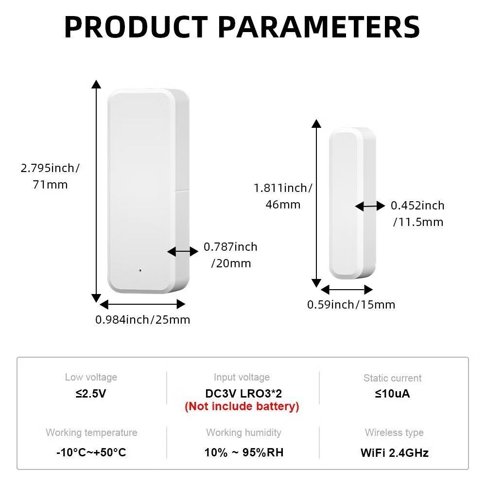 Sensor de Porta e Janela WiFi com Bateria para Alarmes de Segurança em Casa Inteligente Controle de Voz via Alexa e Google Home Parâmetros do produto: ◆ Nome do APP: Sensor de Porta eWelink ◆ Tipo de bateria: AAA 1.5V*2 (Não inclui bateria no envio) ◆ Função de lembrete de bateria baixa ◆ Controles podem ser feitos pelo APP, operação fácil! ◆ Distância de trabalho: ≥15mm ◆ Padrão sem fio: WiFi ◆ Banda WiFi: 2.4GHz ◆ Temperatura de operação: -10℃~55℃ ◆ Umidade de trabalho: 10%~90%RH Conteúdo da embalagem: 1x Sensor de Porta (Não inclui bateria) 1x Adesivo 1x Manual do usuário