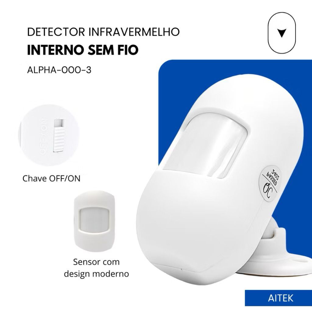 Detector Infravermelho Interno Sem Fio Aitek ALPHA-000-3 O Detector Infravermelho Interno Sem Fio Aitek ALPHA-000-3 é a solução ideal para garantir a segurança de ambientes internos. Com tecnologia de detecção de movimento por infravermelho passivo (PIR), ele identifica a presença de pessoas e envia alertas em tempo real. A instalação é rápida e sem complicações, podendo ser montado em diversas superfícies. Com um design discreto, este detector é perfeito para residências, escritórios e estabelecimentos comerciais que buscam aumentar a segurança de forma eficaz. Características do Produto: Detecção de Movimento: Tecnologia PIR para identificação de movimentos. Sem Fio: Fácil instalação sem necessidade de fiação. Alerta em Tempo Real: Notificações instantâneas ao detectar movimento. Design Discreto: Combina facilmente com qualquer ambiente. Alcance de Detecção: Ideal para áreas internas, como salas e corredores. Vantagens: Aumento da segurança em ambientes internos Instalação rápida e sem complicações Monitoramento eficaz e em tempo real Itens inclusos: 1x Detector Infravermelho Interno Sem Fio Aitek ALPHA-000-3 1x Kit para instalação Especificações técnicas: Modelo: ALPHA-000-3 Tipo: Detector de movimento PIR Alimentação: Baterias (incluídas) Bateria Interna: 3V CR2450 Bateria Standby current: < 15uA Working current: < 25mA Área de detecção: 4-8m Distancia sem fio: 100m(área aberta) Frequência sem fio: 433MHz