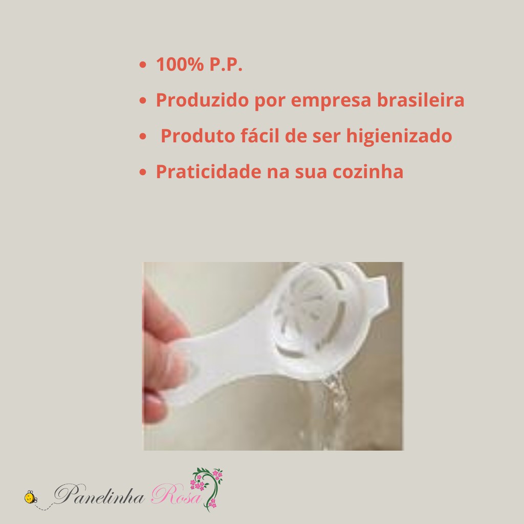 Nossa empresa visa a satisfação plena do cliente, desde o atendimento na hora da sua compra até o momento da entrega do seu pedido. Somos a Panelinha Rosa 🌹 temos em nosso portfolio principal você, que faz com que nossa empresa cresça cada vez mais. PRODUTO: 1 (uma) unidade do Separador de claras e gemas O separador de Clara e Gema é útil, prático e higiênico. Muito fácil de usar, basta quebrar o ovo em cima da peça que ela vai separar a clara, retendo a gema. Qualquer informação estamos a disposição em nosso chat.