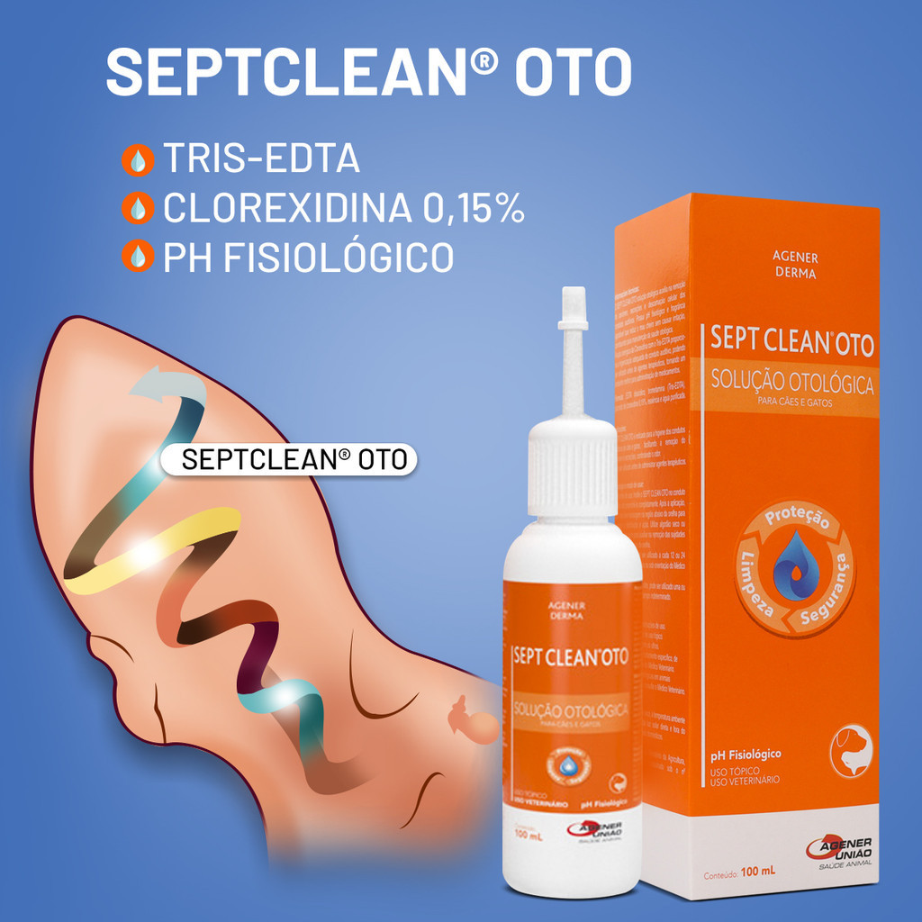 SeptClean Oto - Higiene dos Condutos Auditivos para Cães e Gatos SeptClean Oto é especialmente formulado para a higiene dos condutos auditivos de cães e gatos. Facilita a remoção do cerúmen e secreções, ajudando a controlar o odor. Ideal para ser utilizado antes da administração de agentes terapêuticos. Modo de Usar: 1-Agite antes de usar. 2-Instile SeptClean Oto no conduto auditivo até preenchê-lo completamente. 3-Após a aplicação, massageie levemente a região abaixo da orelha para favorecer a distribuição e ação do produto. 4-Utilize algodão seco ou compressa de gaze para auxiliar na remoção das sujidades e secar a região externa. Duração do Tratamento: -Recomendado por 14 dias ou conforme orientação do Médico Veterinário. -Para animais predispostos a otite, pode ser utilizado uma ou duas vezes por semana por tempo indeterminado. Benefícios: -Facilita a remoção do cerúmen e secreções. -Controla o odor dos condutos auditivos. -Ideal para uso antes de agentes terapêuticos. -Pode ser utilizado regularmente em animais predispostos a otite. ____________________________________________________________________________ ESPECIFICAÇÃO - Indicado: Cães e Gatos; - Unidade: 100ml; - Tipo de raça indicada: Todas. ____________________________________________________________________________ Gostou? Não perca tempo, garanta já o seu!