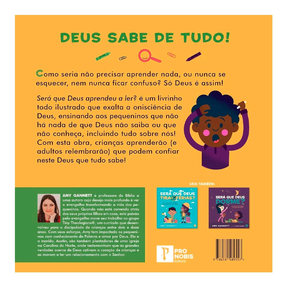 Deus Sabe de Tudo! Como seria não precisar aprender nada, nunca se esquecer ou ficar confuso? Só Deus é assim! Será que Ele aprendeu a ler? Este livro ilustrado exalta a onisciência divina, mostrando aos pequenos que não há nada que Deus não saiba ou não conheça, incluindo tudo sobre nós! Com essa obra, as crianças aprenderão (e os adultos relembrarão) que podem confiar em um Deus que sabe todas as coisas. Amy Gannett é professora de Bíblia e autora, dedicada a ver o evangelho transformar a vida das crianças. Quando não está cuidando dos próprios filhos, ela trabalha no *Tiny Theologians*, um currículo que desenvolveu para discipular crianças de 2 a 12 anos. Junto com o marido, Austin, Amy é plantadora de igreja na Carolina do Norte, onde testemunha como as grandes verdades sobre Deus cativam os corações dos pequenos, levando-os a um relacionamento com o Senhor.