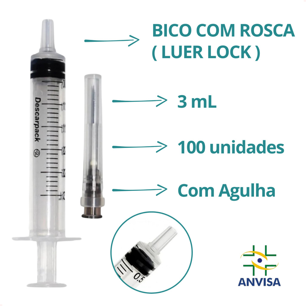 Seringa 3ml 25X0,7cm 100un Com Agulha Luer Slip - Envio Imediato